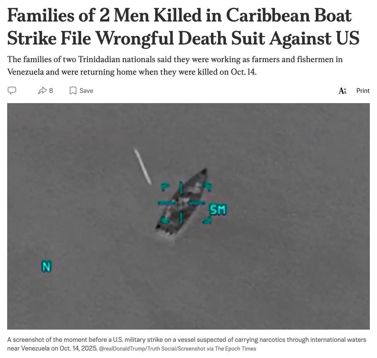 Семьи двух граждан Тринидада и Тобаго подали в суд на администрацию Трампа. Они заявляют, что их родственников убили 14 октября 2025 года в Карибском море у побережья Венесуэлы, когда США нанесли удар по небольшому катеру, который американские военные сочли «наркосудам» и подозревали в перевозке наркотиков.