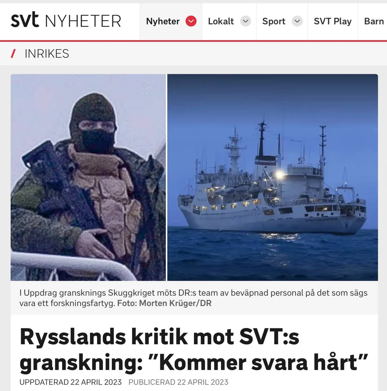 Добавлю, что фото, которое расходится по сети (фото 1), из статьи того же шведского портала SVT аж от 2023 года (фото 2), тогда шведы писали, что наши «шпионские суда» находились в шведских водах в последние годы, а также что ряд подозреваемых российских разведчиков работает в Швеции под дипломатическим прикрытием.