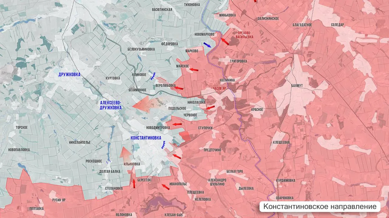 ▪️На Константиновском участке в районе Берестка ВСУ контратакуют, ВС РФ отбивают атаки и зачищают территории к северу от Клебан-Быкского водохранилища. Со стороны Ильиновки наши бойцы стараются закрепиться на западных окраинах Константиновки. К востоку от города наши части зачищают территорию между Червоным и Новодмитровкой, охватывая Константиновку плотным кольцом с востока. По линии сёл от Майского до Голубовки идут ожесточённые позиционные бои за каждый опорный пункт.