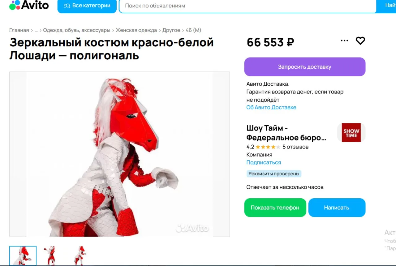 Его можно заказать за 66 553 рубля на популярном сайте для размещения объявлений. Продавец отмечает, что костюм подойдет для выступлений на корпоративах, праздниках или фотосессиях. Изготовление происходит по индивидуальным требованиям заказчиков.