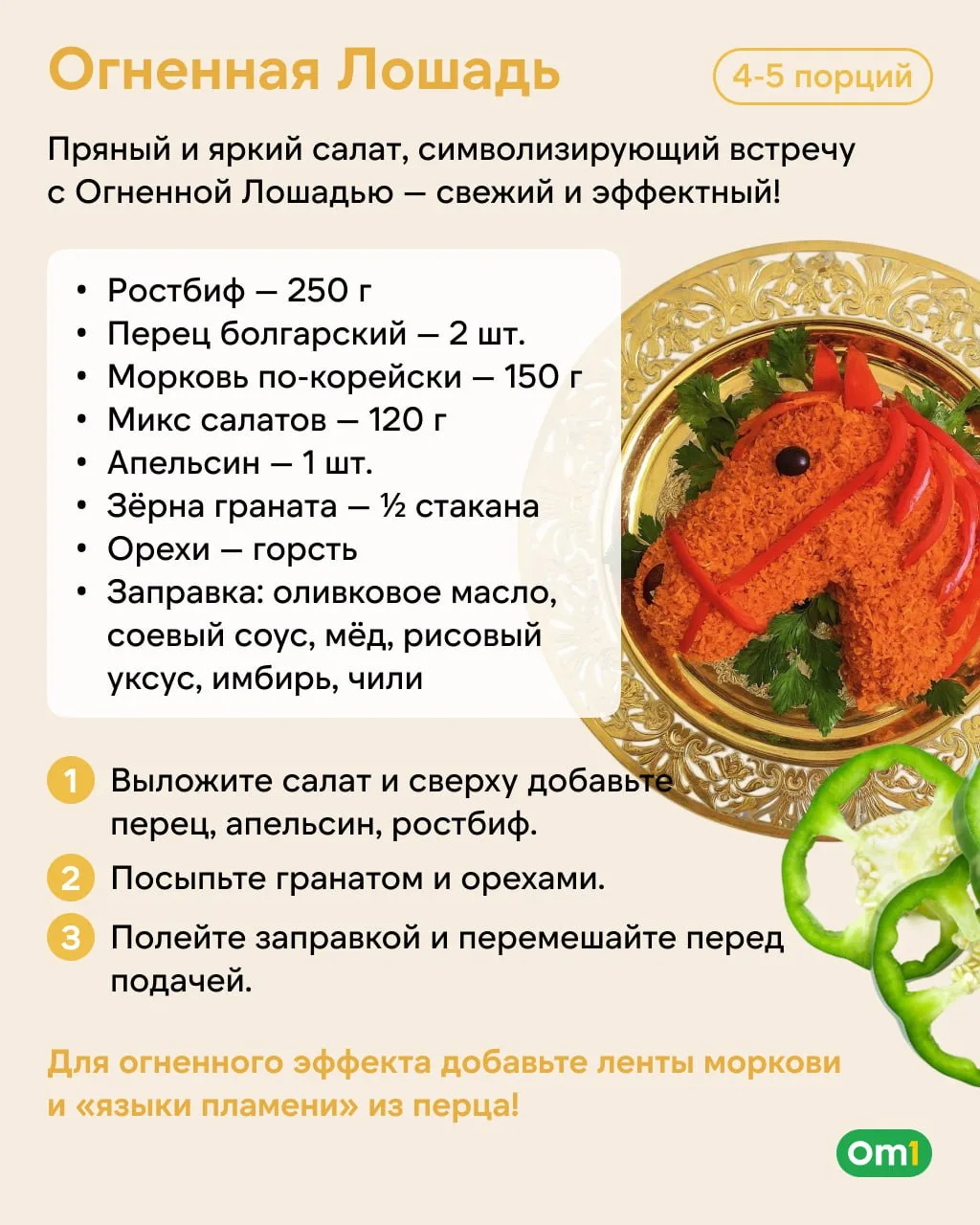 В нашем списке — проверенная классика, новинка, которая удивит, эффектное блюдо, которое все будут фотографировать, супербыстрая закуска для занятых хозяек и, конечно, салат, вдохновлённый годом Огненной Лошади!