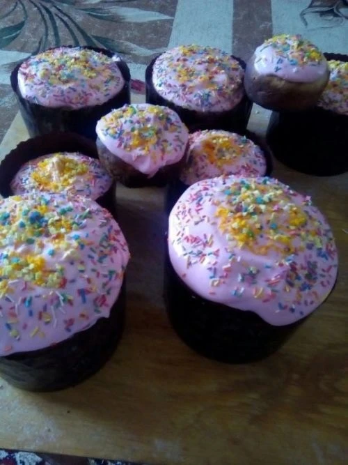 🧁Куличлар суынгач бизәргә мөмкин. Йомырка агы белән шикәр комын бутап ягарга, кондитер бизәкләре сибәргә, әфлисун кабыгын уарга.