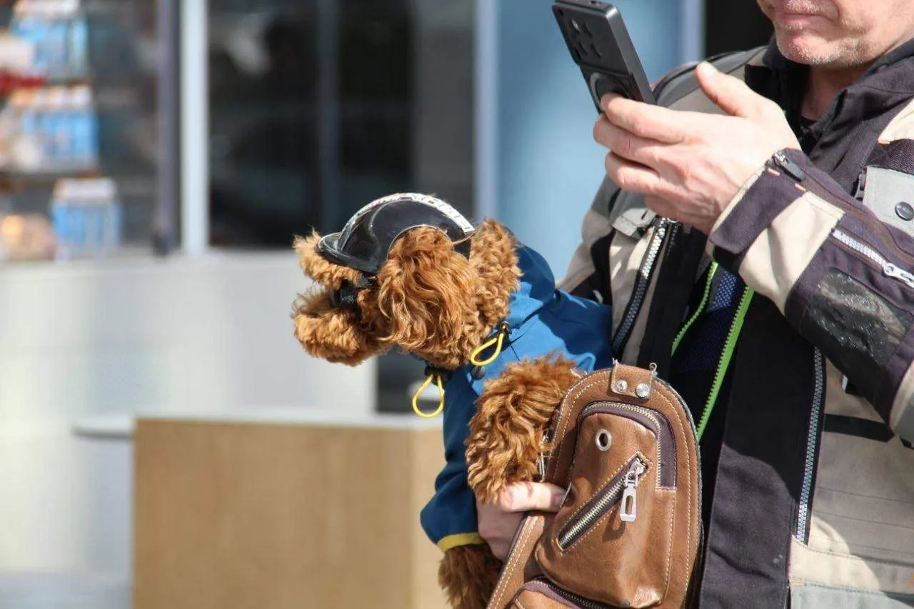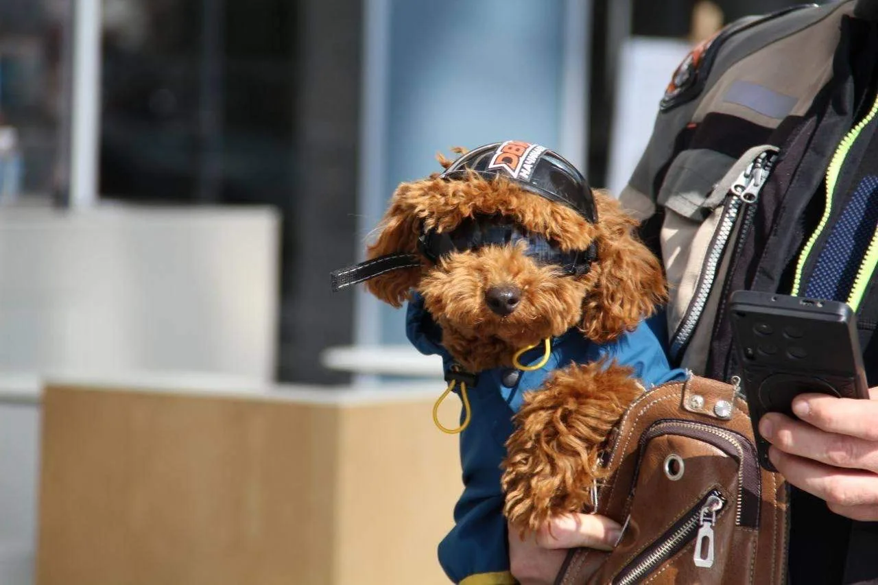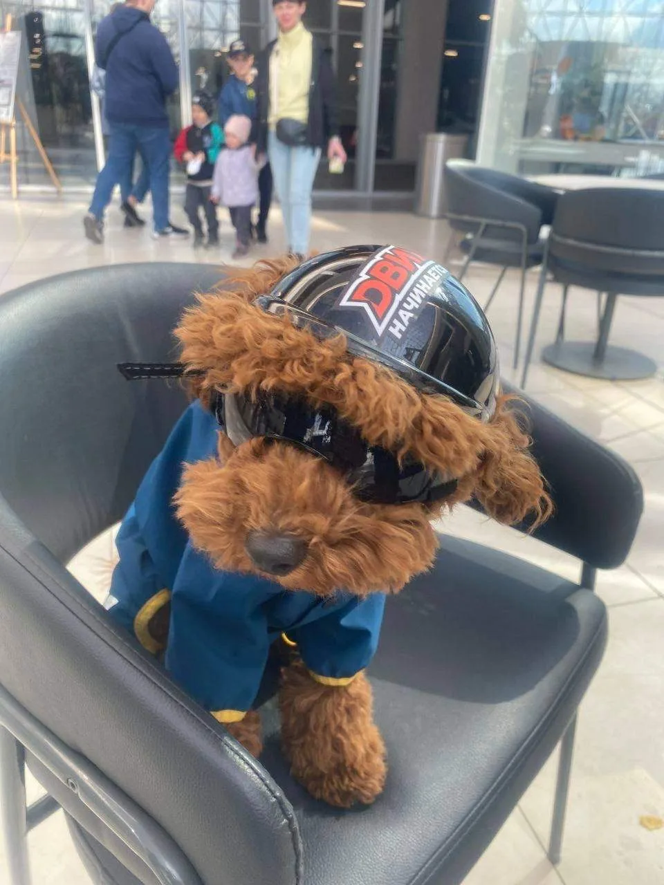Мотоциклист перевозил пса в мотошлеме и даже защитных очках! Также не можем не отметить очаровательный костюмчик.