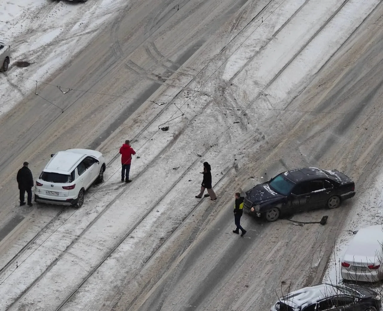 Прямо на путях столкнулись два легковых авто, сообщают очевидцы.