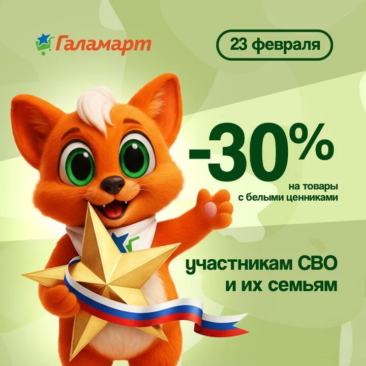 🎖 23 февраля для участников специальной военной операции (СВО), действует скидка 30% на товары с белыми ценниками.