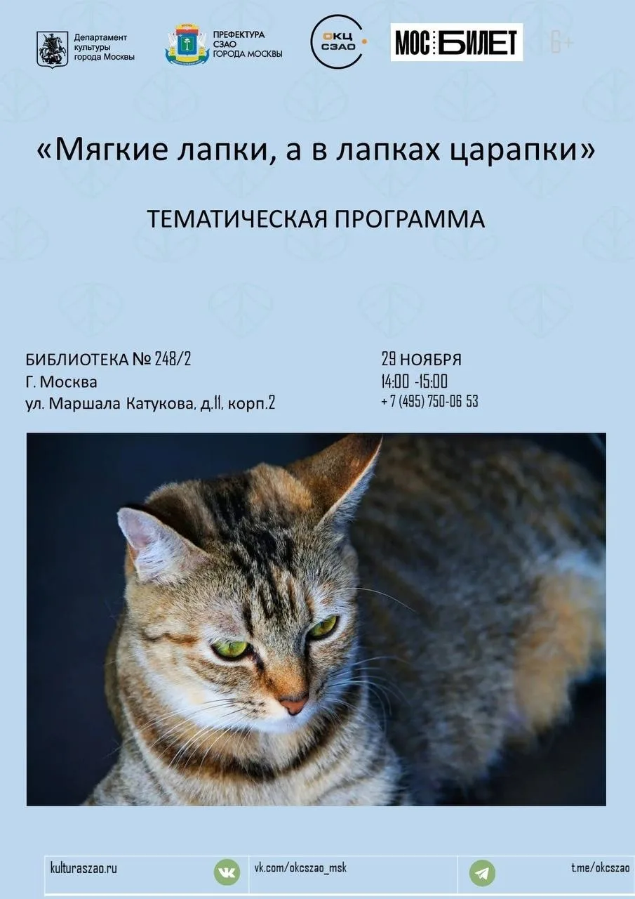 📔 Библиотеке №248/2 проведет познавательный час «Мягкие лапки, а в лапках царапки», для любителей кошек.