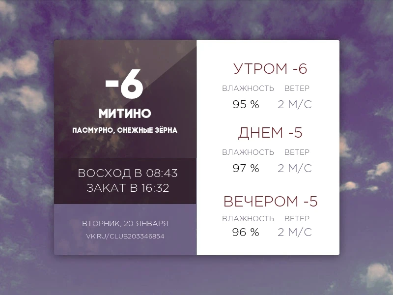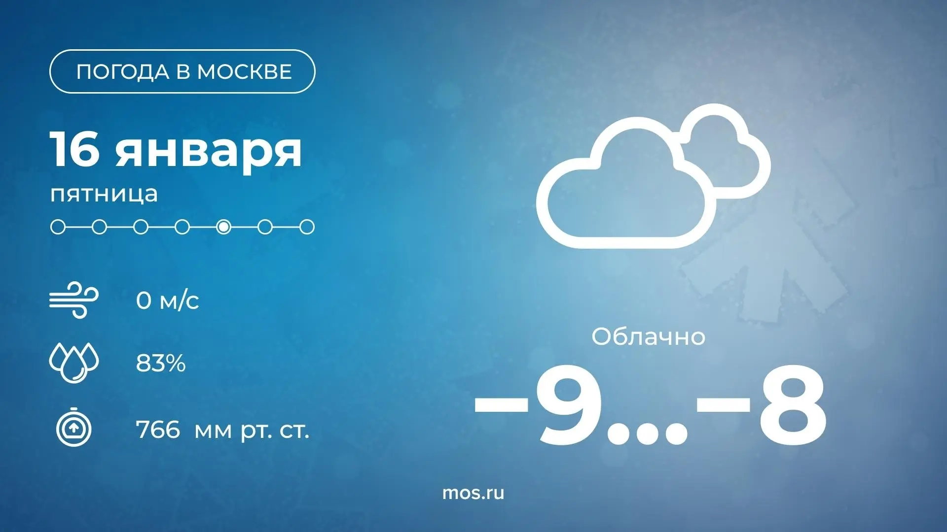 ☁Сегодня в Москве будет облачная погода. Столбики термометров покажут от −9 до −8 °С. Одевайтесь теплее!