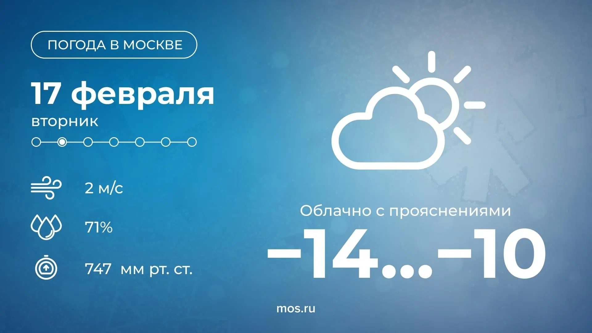 Сегодня в Москве будет облачно с прояснениями. Столбики термометров днем покажут от −14 до −10 °С. Одевайтесь теплее!