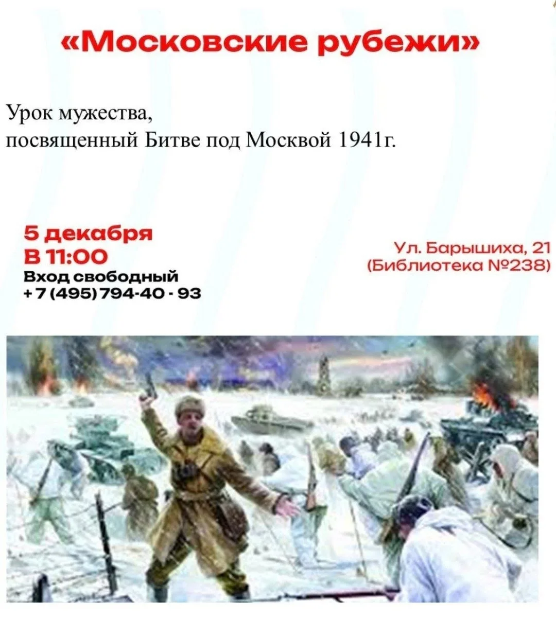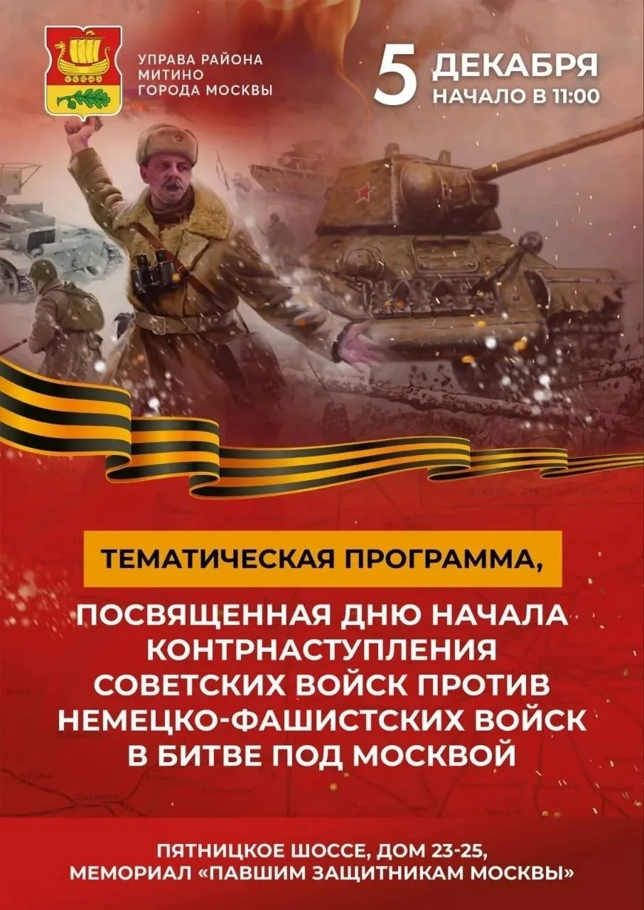 🎖05 декабря в 11:00 в районе Митино состоится тематическая программа, приуроченная к началу контрнаступления советских войск против немецко-фашистских сил в битве за Москву.