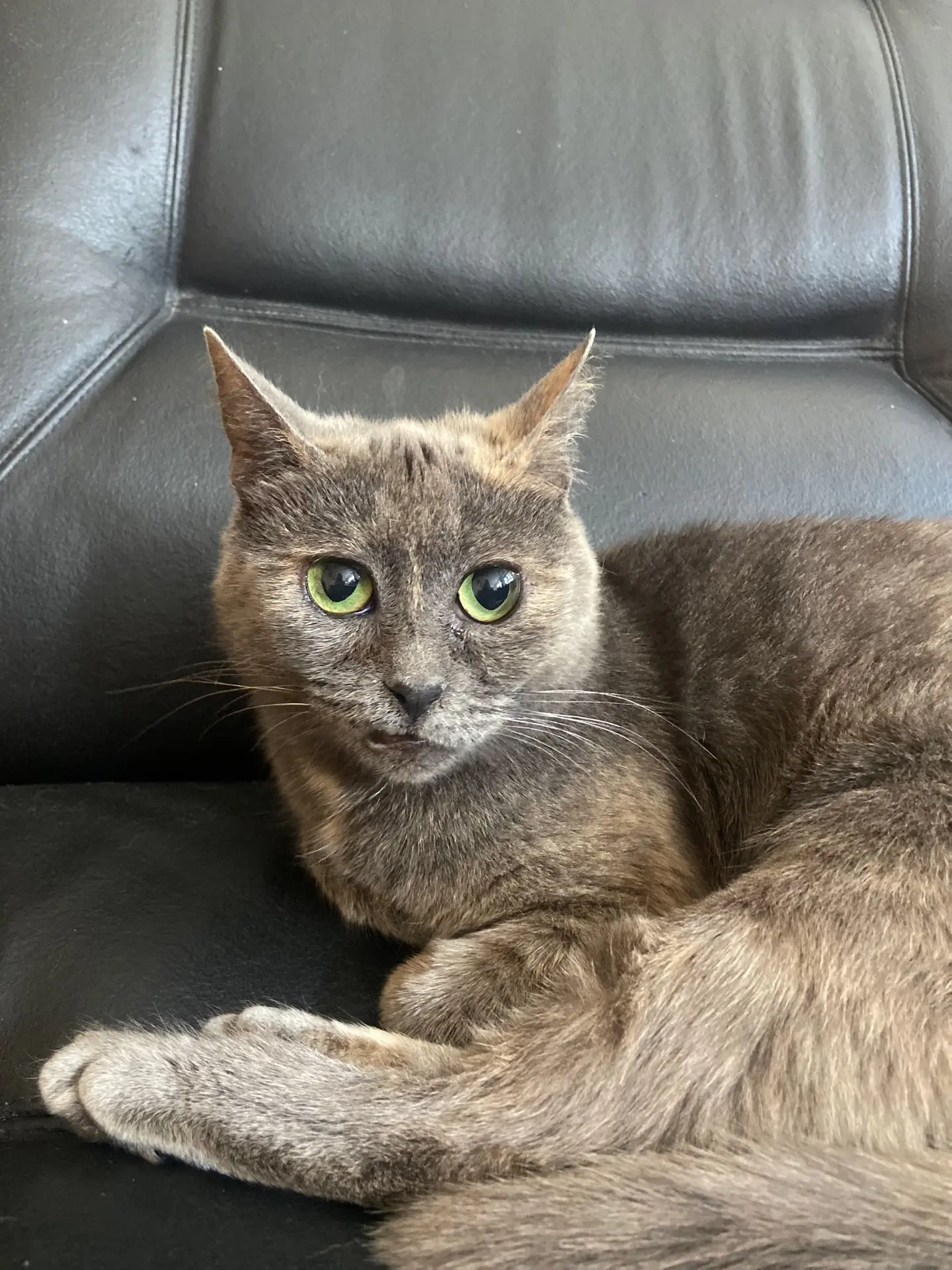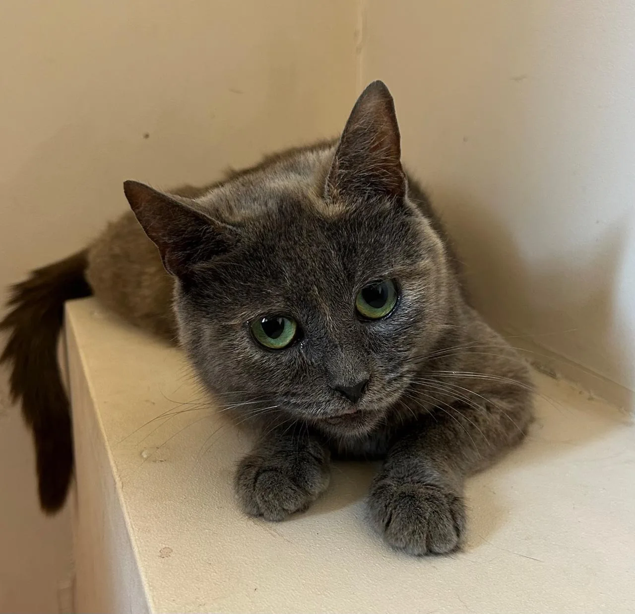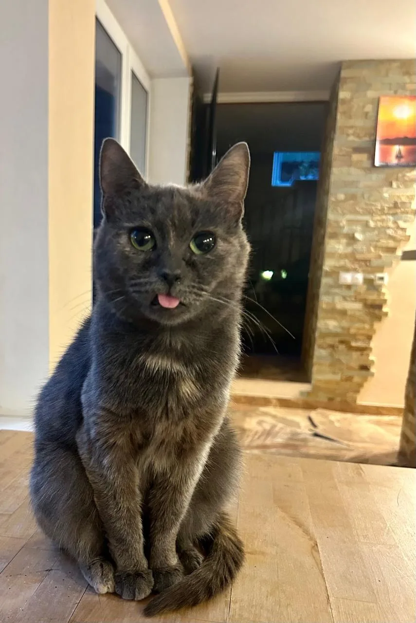 Невероятно ласковая и скромная кошечка Тишка-Мартишка, 4 года. Тишка - потому что тихоня, Мартишка - игрунья как мартышка) Метис русской голубой (круглая мордочка, изумрудные глаза) с рыжими подпалинами на шубке — очень необычная и милая красавица! После удаления зубов у нее иногда вываливается язык. Жить и кушать ей это не мешает, хотя иногда из-за этого у нее дурашливый вид и она сопит, как ежик)