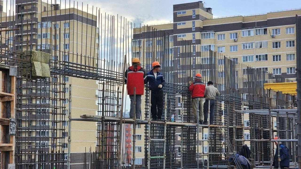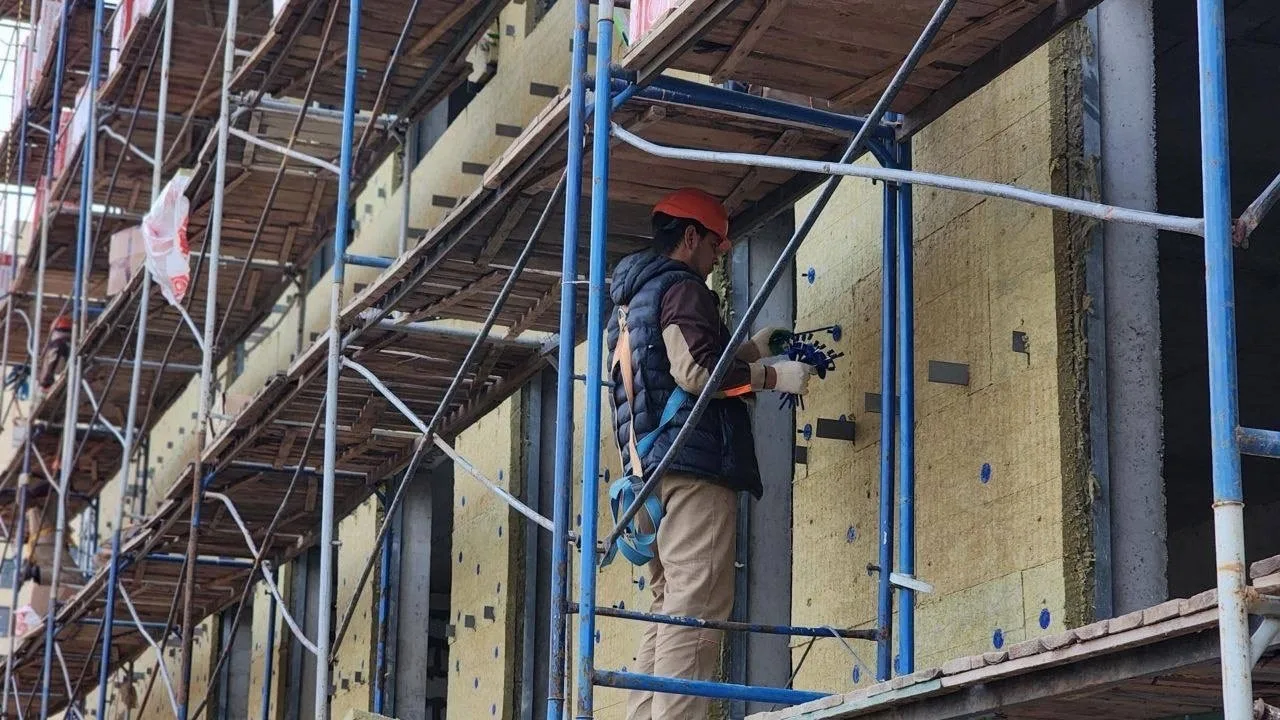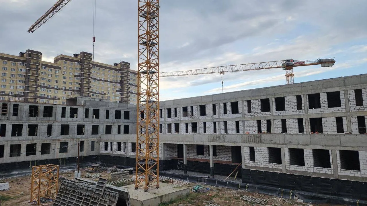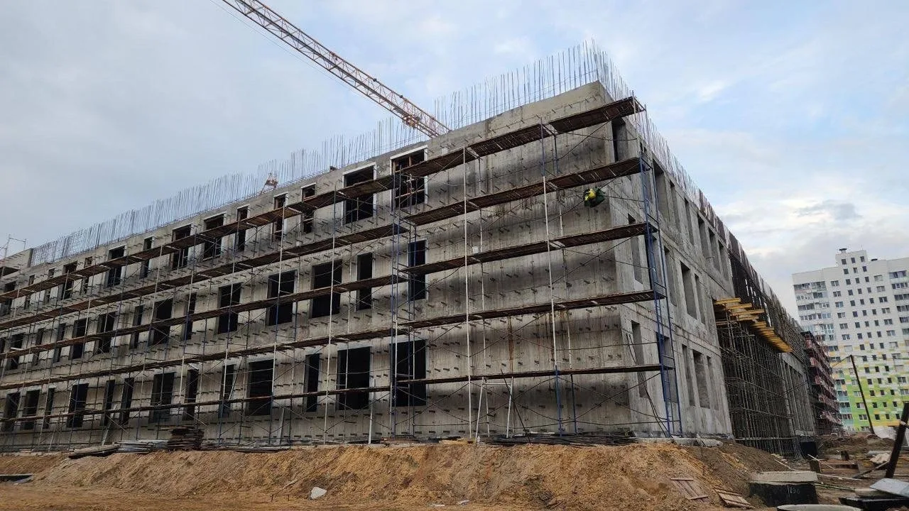 Строительство школы в посёлке городского типа идёт полным ходом. Уже через год здесь будут сидеть ученики за партами, а пока строители завершают возведение третьего этажа и уже приступили к утеплению фасада здания.