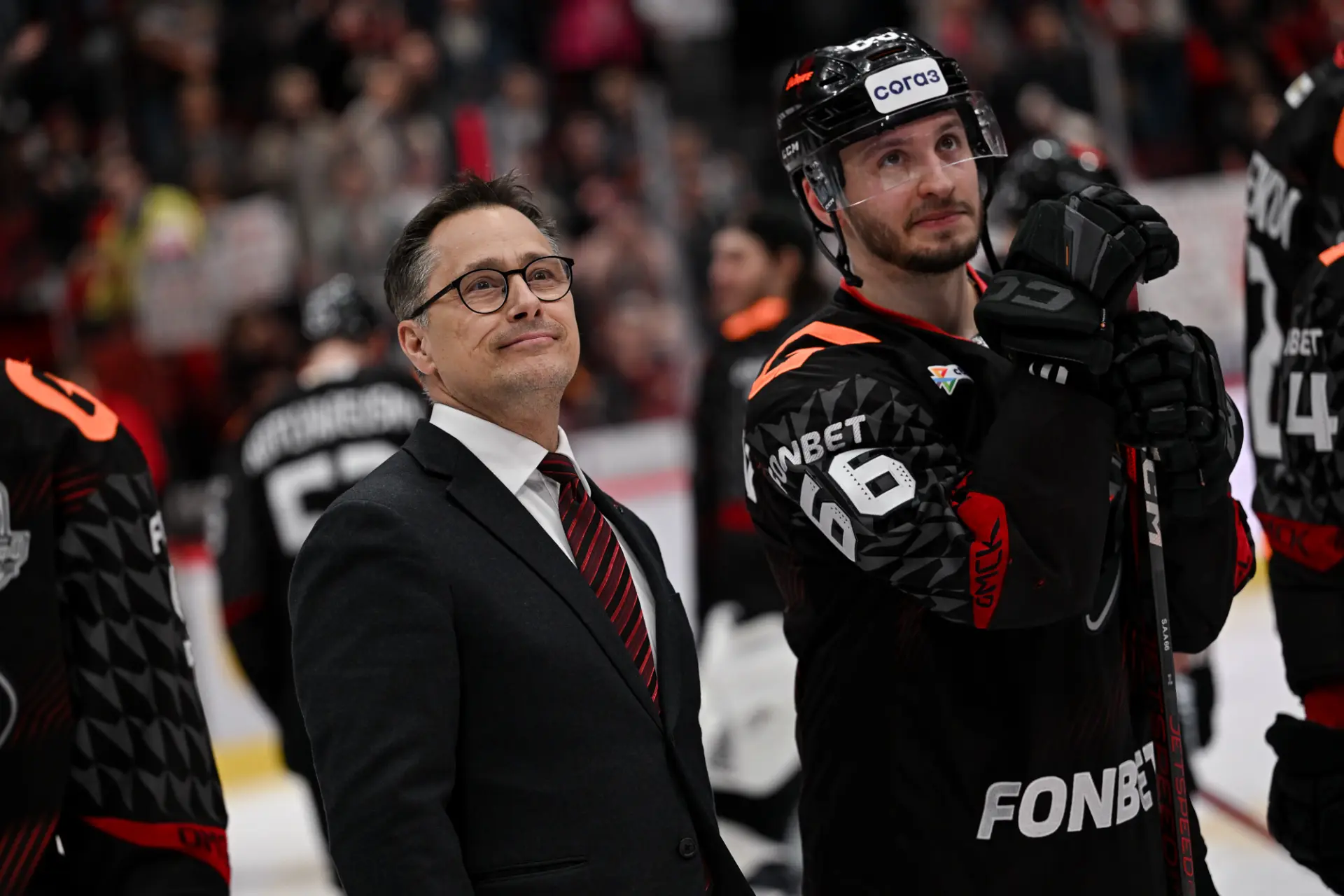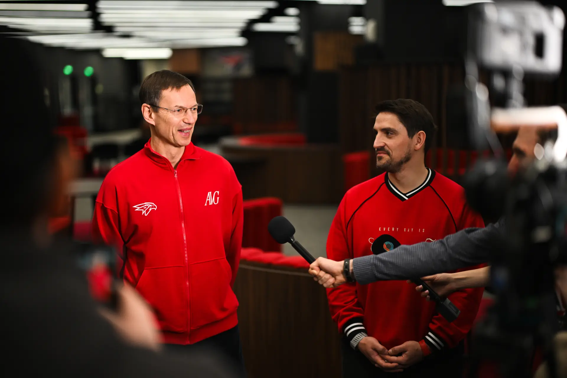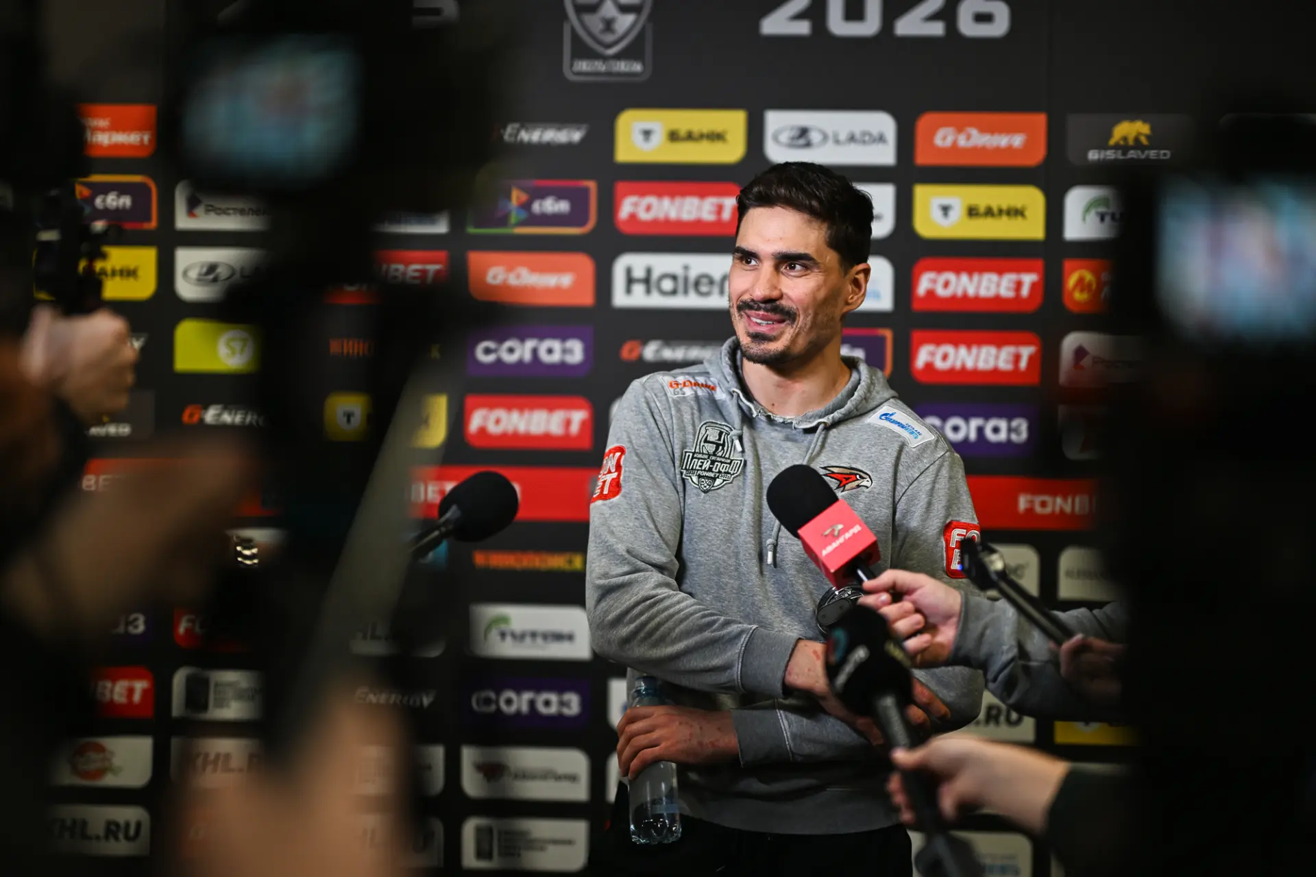 С журналистами пообщались генеральный директор «Авангарда» Герман Чистяков, генеральный менеджер Алексей Сопин, главный тренер Ги Буше, а также игроки команды Константин Окулов и Наиль Якупов.