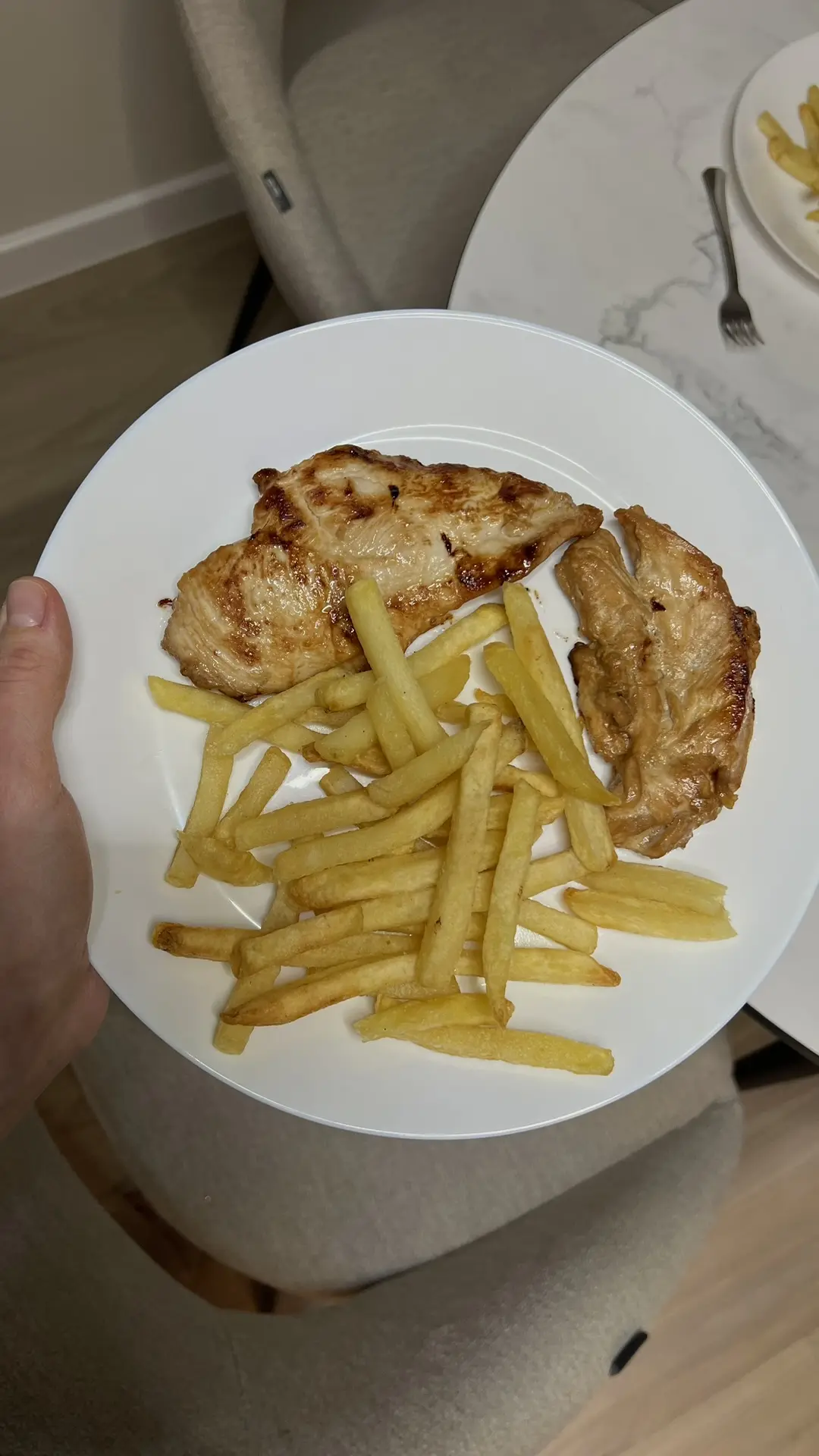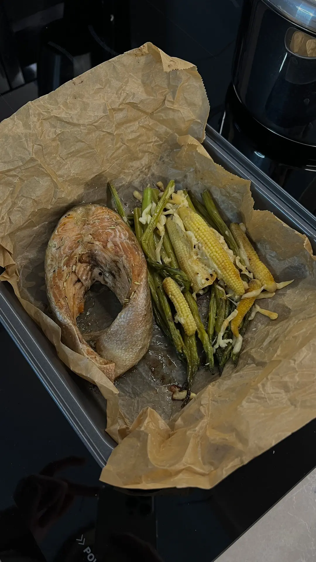 У детей на ужин картошка фри приготовленная без масла в аэрогриле с куриной грудкой. У меня форель, спаржа, кукуруза и пармезан (сыр был лишним))