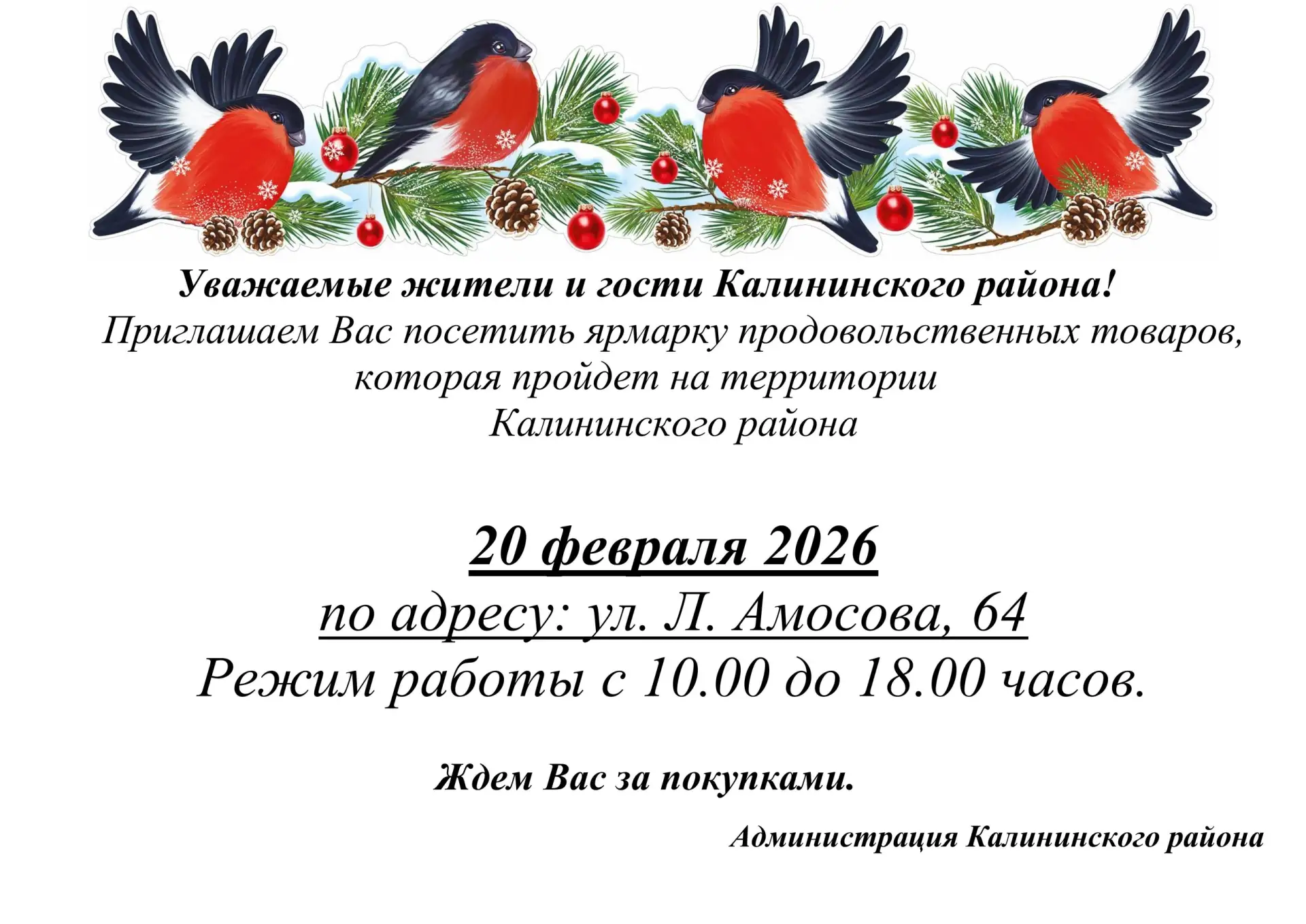 Жители и гости Калинского района смогут посетить ярмарку 20 февраля с 10.00 до 18.00 по адресу ул. Л. Амосова, 64.