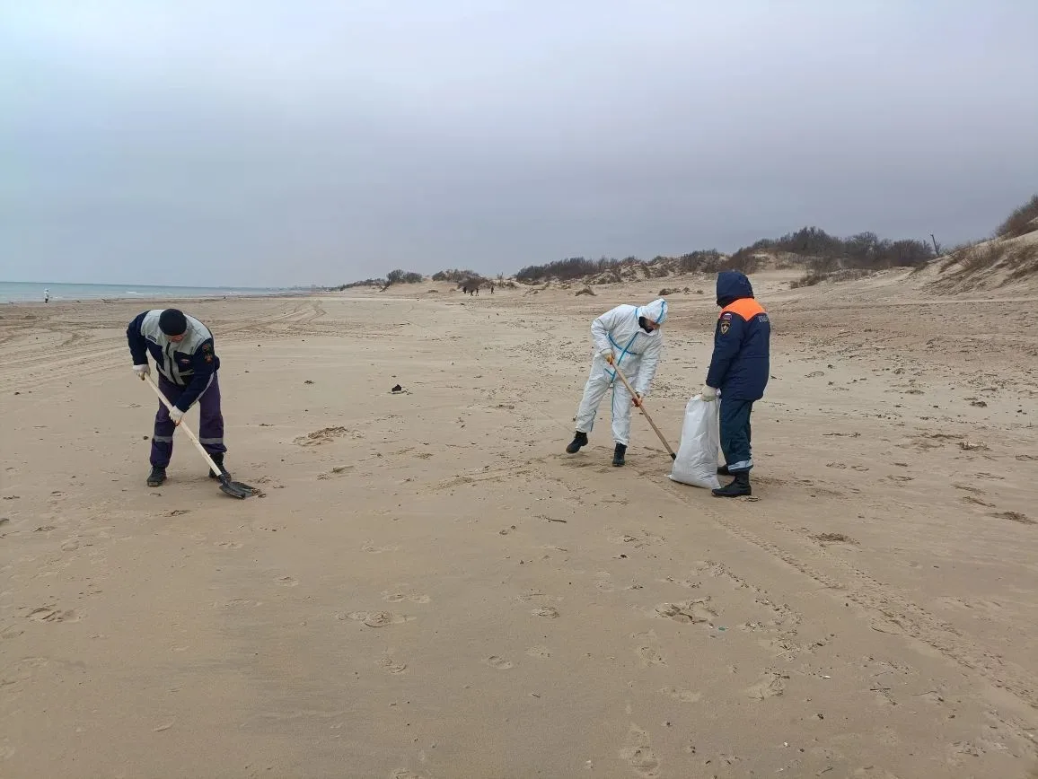 Небольшие фрагменты нефтепродуктов убирают сотрудники Кубань-СПАС и волонтеры.