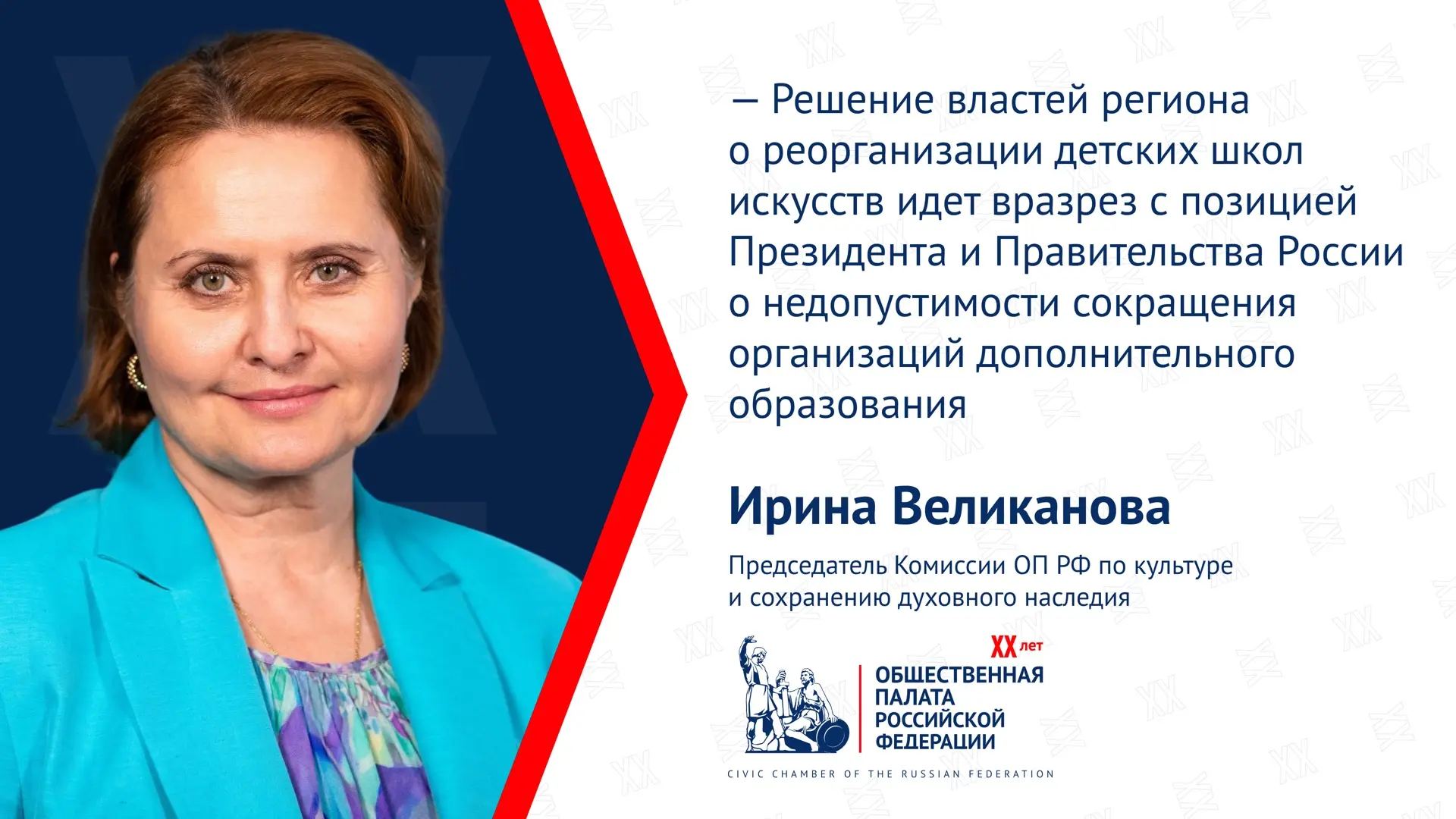 Члены Комиссии ОП РФ по культуре и сохранению духовного наследия рассмотрели обращение жителей Углича, выразивших несогласие с реорганизацией. Председатель Комиссии Ирина Великанова направила обращение Губернатору региона Михаилу Евраеву, в котором подчеркнула, что, согласно Федеральному закону «Об образовании в Российской Федерации», дополнительные предпрофессиональные программы в области искусств могут реализовываться только в образовательных организациях.