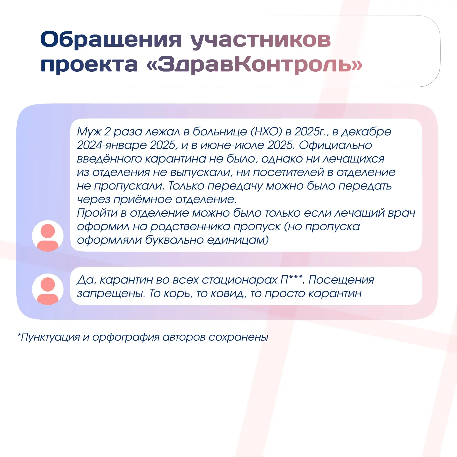 ➡️ Опрос, проведенный на канале Проекта в январе 2025 года, в котором приняли участие более 3 тыс. человек, показывает, что более 50% пациентов сталкиваются с запретом на посещения во время госпитализации.
