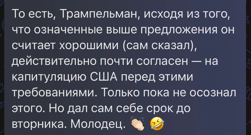 То есть, Трампельман, исходя из того, что означенные выше предложения он считает хорошими (сам сказал), действительно почти согласен — на капитуляцию США перед этими требованиями. Только пока не осознал этого. Но дал сам себе срок до вторника. Молодец. 👏🏻 🤣