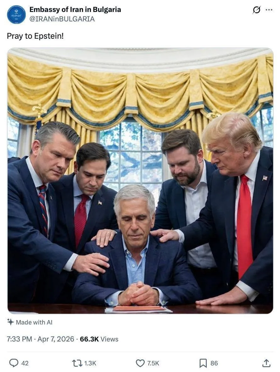«Молитесь на Эпштейна!», — прикалывается посольство Ирана в Болгарии.