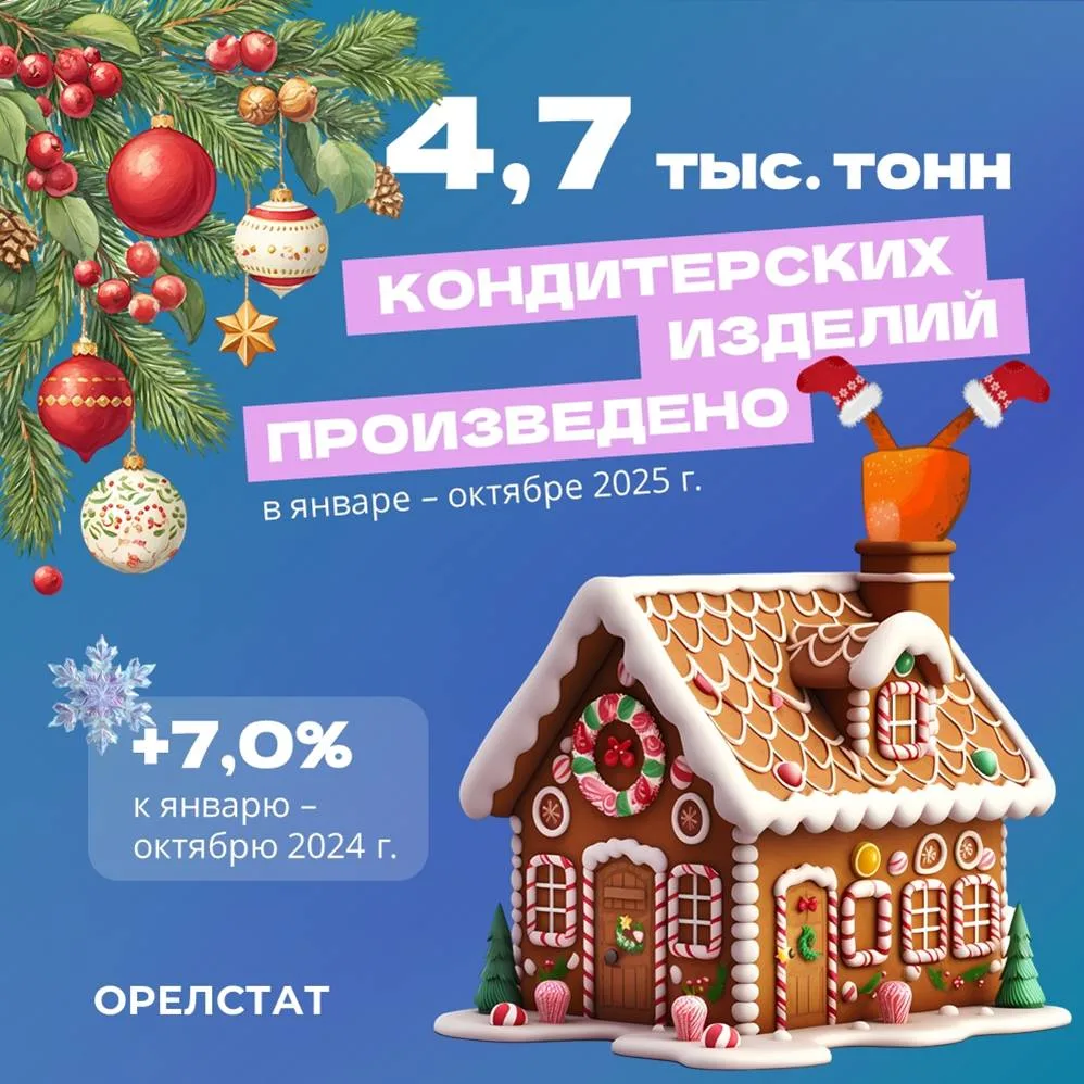 За 2024 год орловские предприятия произвели 5,3 тыс. тонн кондитерских изделий — на 3,2% больше, чем годом ранее.