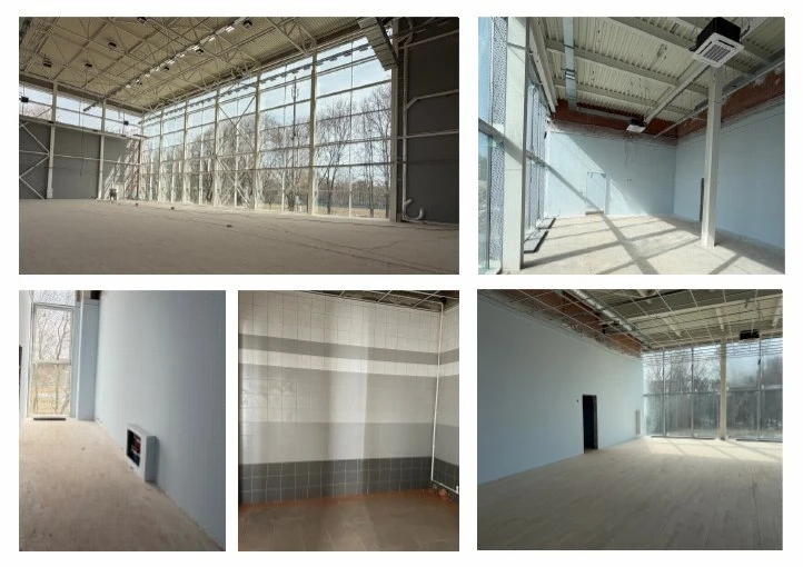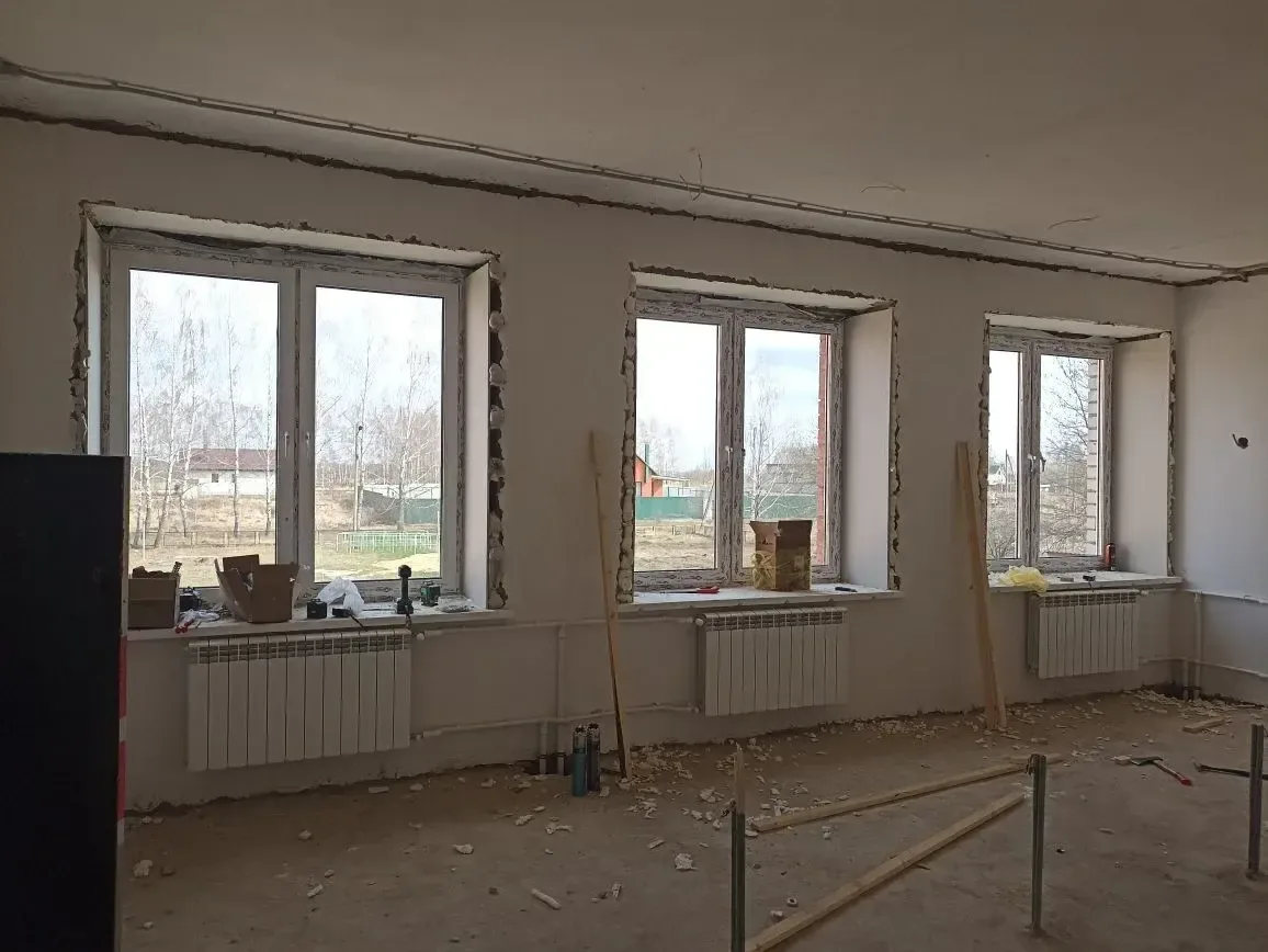 После демонтажных работ в школьном здании рабочие штукатурят стены, монтируют новую электропроводку, канализацию, систему отопления. Подрядчик установил новые оконные блоки и уже приступил к ремонту кровли.