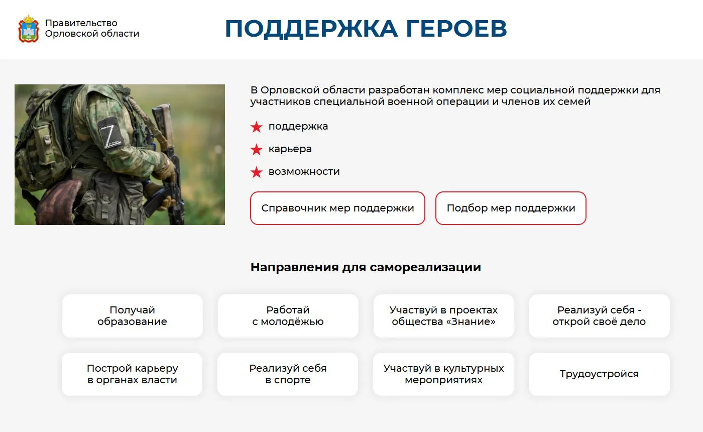 💻На орловском портале «Поддержка героев» участников СВО и членов их семей оперативно информируют о персональном перечне мер поддержки