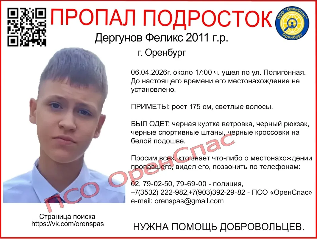 В Оренбурге разыскивается несовершеннолетний: Дергунов Феликс, 2011 года рождения.