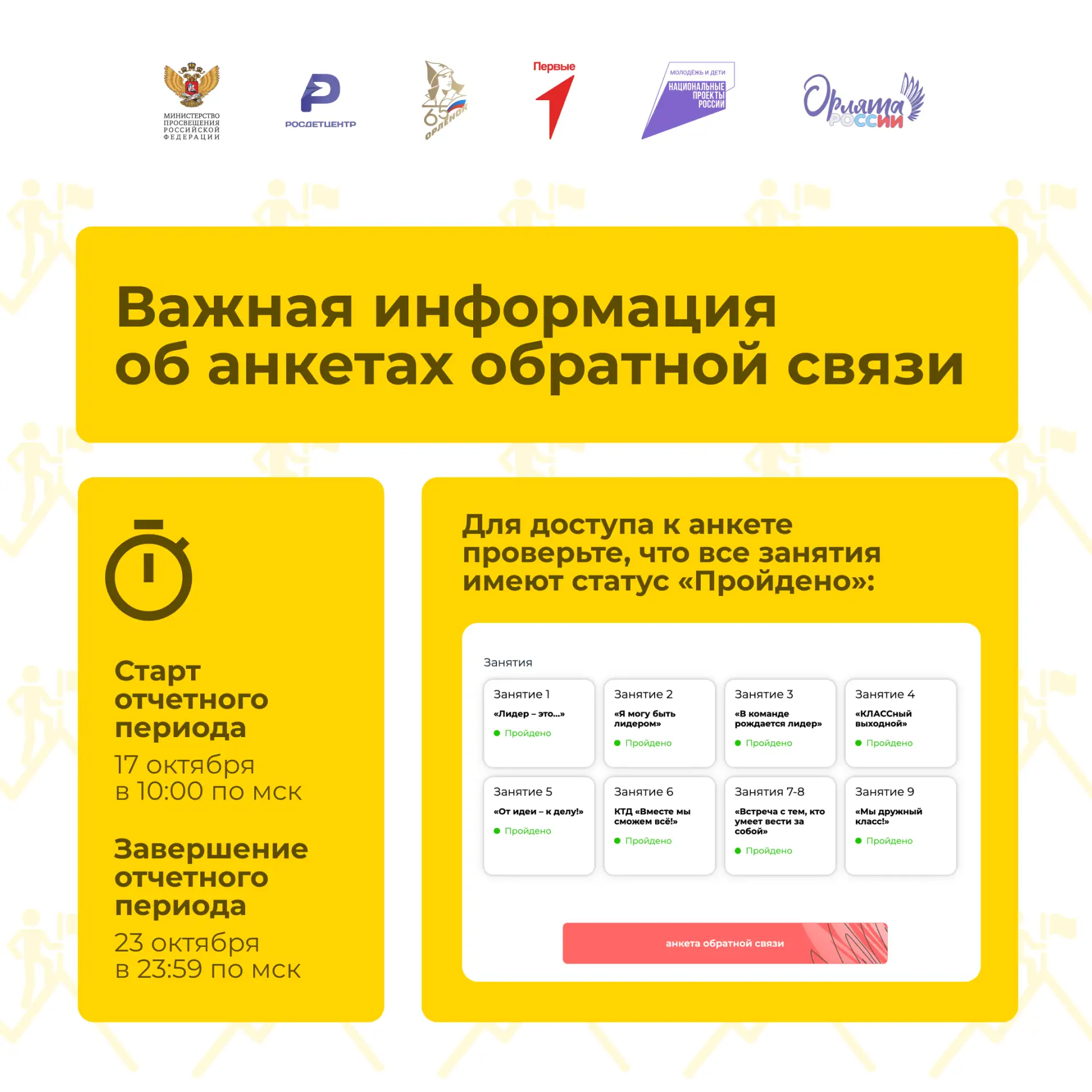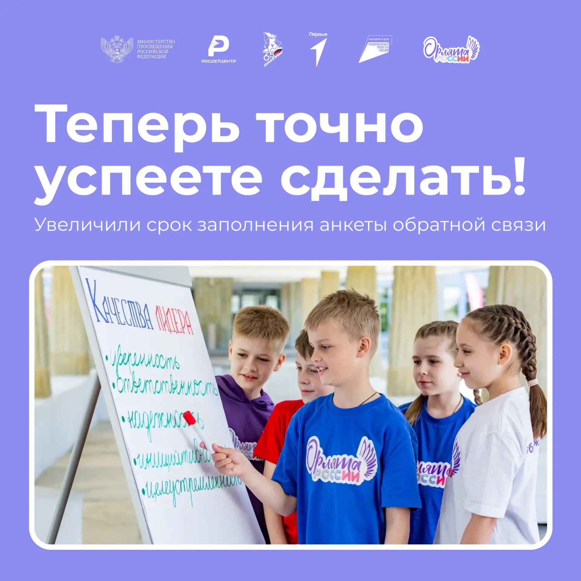 👉🏻 Мы продлеваем срок заполнения анкеты обратной связи по треку «Орлёнок – Лидер» для учащихся 2–4 классов. Теперь заполнить анкету можно до 23:59 по мск 26 октября.