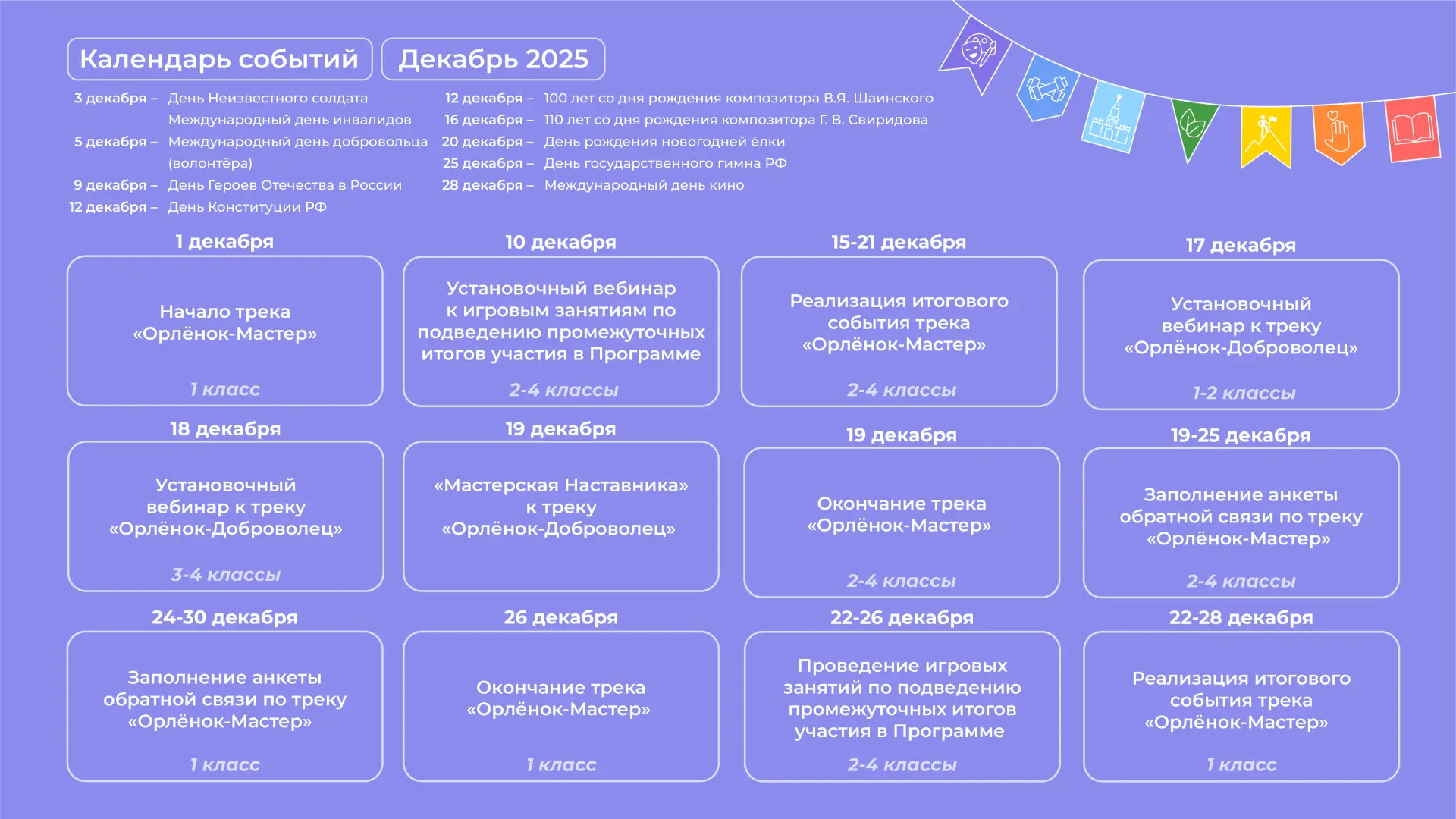 Первый зимний месяц уже здесь, а значит, самое время обновить календарь событий на месяц. В декабре Орлят, учителей, и наставников Орлят, а также советников директоров по воспитанию ждут: