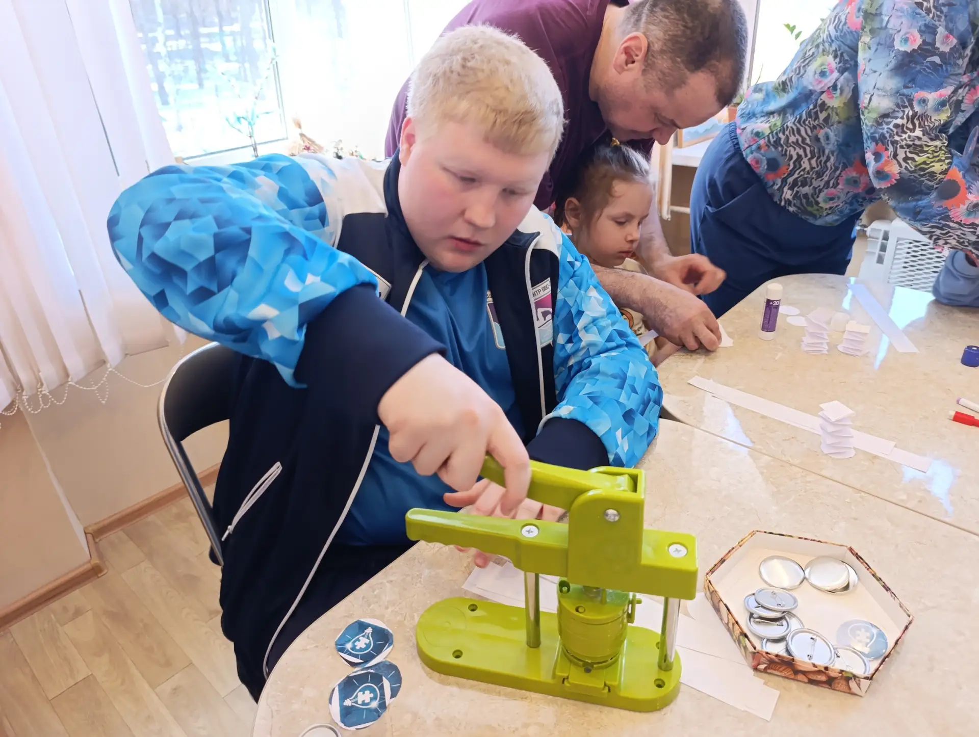 Гости отделения «Водолей» филиала комплексного центра социального обслуживания населения Первомайского района посмотрели душевный мультфильм «Кастрюлька Анатоля» о ребёнке с особенностями развития. После просмотра дети вместе со специалистом обсудили историю героя и поделились своими чувствами и мыслями. Также для ребят организовали творческий мастер-класс, где они сделали весёлых синих человечков на ножках-пружинках из воздушных шаров. Специальные гости мероприятия – выпускники «Водолея» - Илья Дедюкин и Иван Школьников в это время занимались изготовлением значков с эмблемой «Зажги синим!». Их они подарили всем тем, кто пришел поддержать акцию.