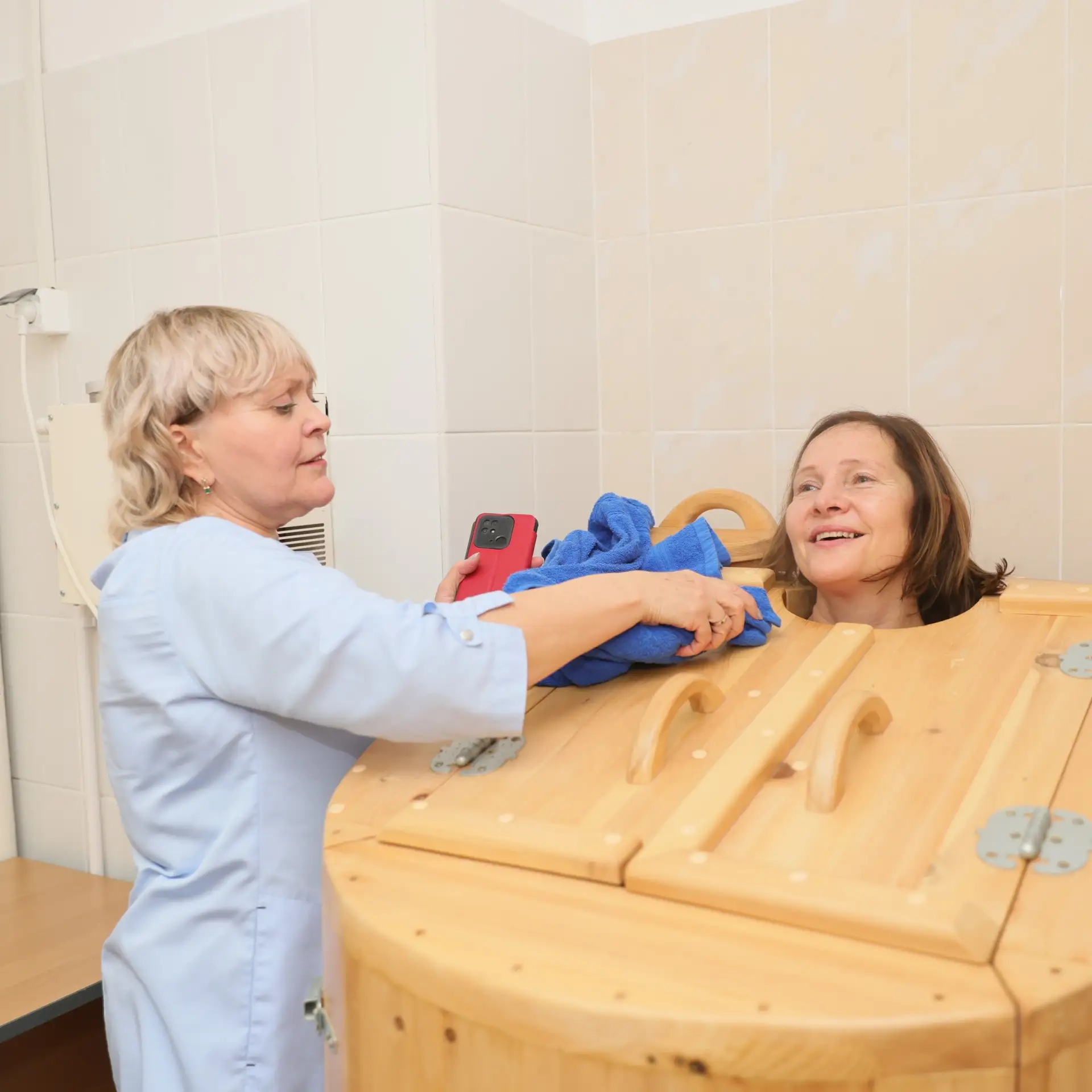 📣 Кедровая бочка (её также называют фитосауной или фитобочкой) представляет собой компактную сауну из натурального кедра в форме бочки. Особенность процедуры в том, что тело прогревается паром с добавлением эфирных масел и экстрактов целебных трав до температуры 40–60 °C, а голова при этом остаётся снаружи. Благодаря такому решению нагрузка на организм снижается — сеанс получается комфортным и щадящим. После процедуры нужно отдохнуть 20–30 минут и выпить для восполнения жидкости чашку травяного чая.