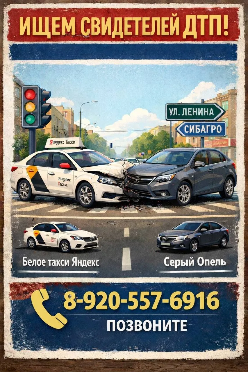 Если у кого то есть запись видеорегистратора момента ДТП на улице Ленина перекресток Сибагро между автомобилем белым такси Яндекса и серым Опелем 7 апреля ориентировочно 10 часов 12 минут просьба позвонить на номер 89205576916