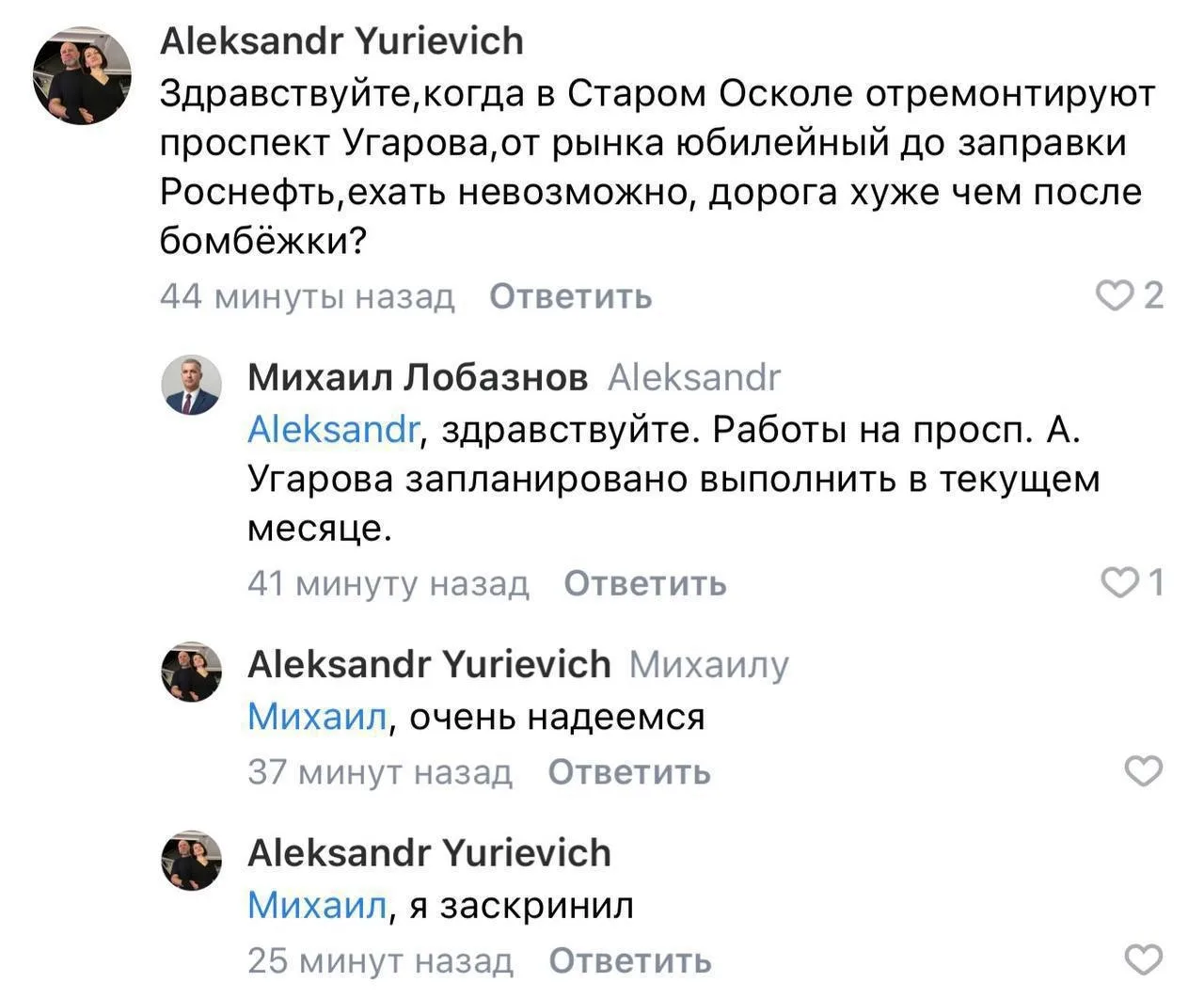 Когда отремонтируют дорогу на угарова от рынка до АЗС, уже все диски погнул и я в том числе со всеми водителями, да закатайте уже эти ямы и всё, сколько можно, многие приезжают с разных городов едут на рынок, дорога на Белгород, Воронеж, а главная дорога в ужасном состоянии причем очень долго уже,выставьте пожалуйста пост