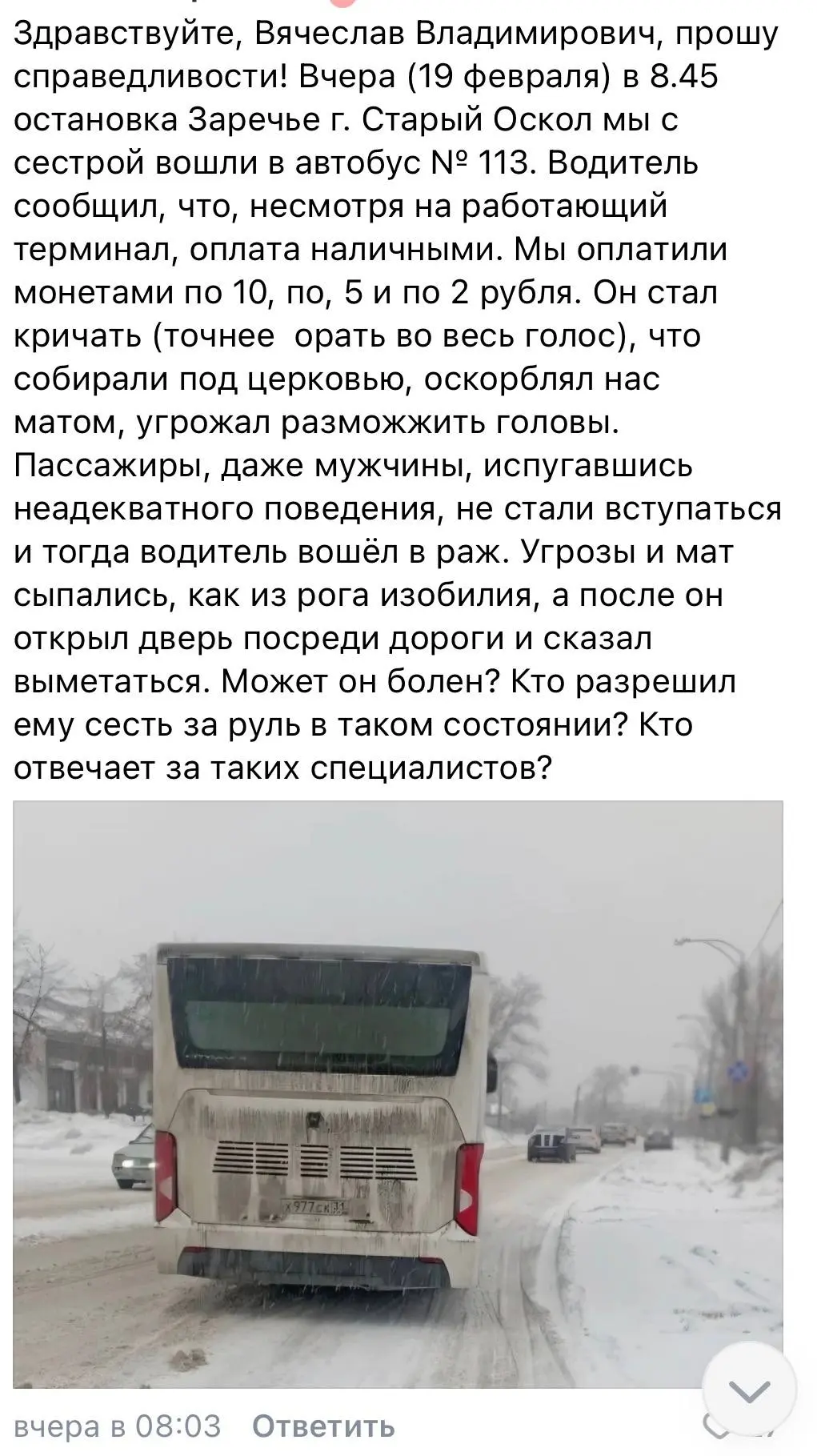 В Старый Оскол жительница пожаловалась на водителя автобуса №113, оставив обращение на странице губернатора Вячеслав Гладков.