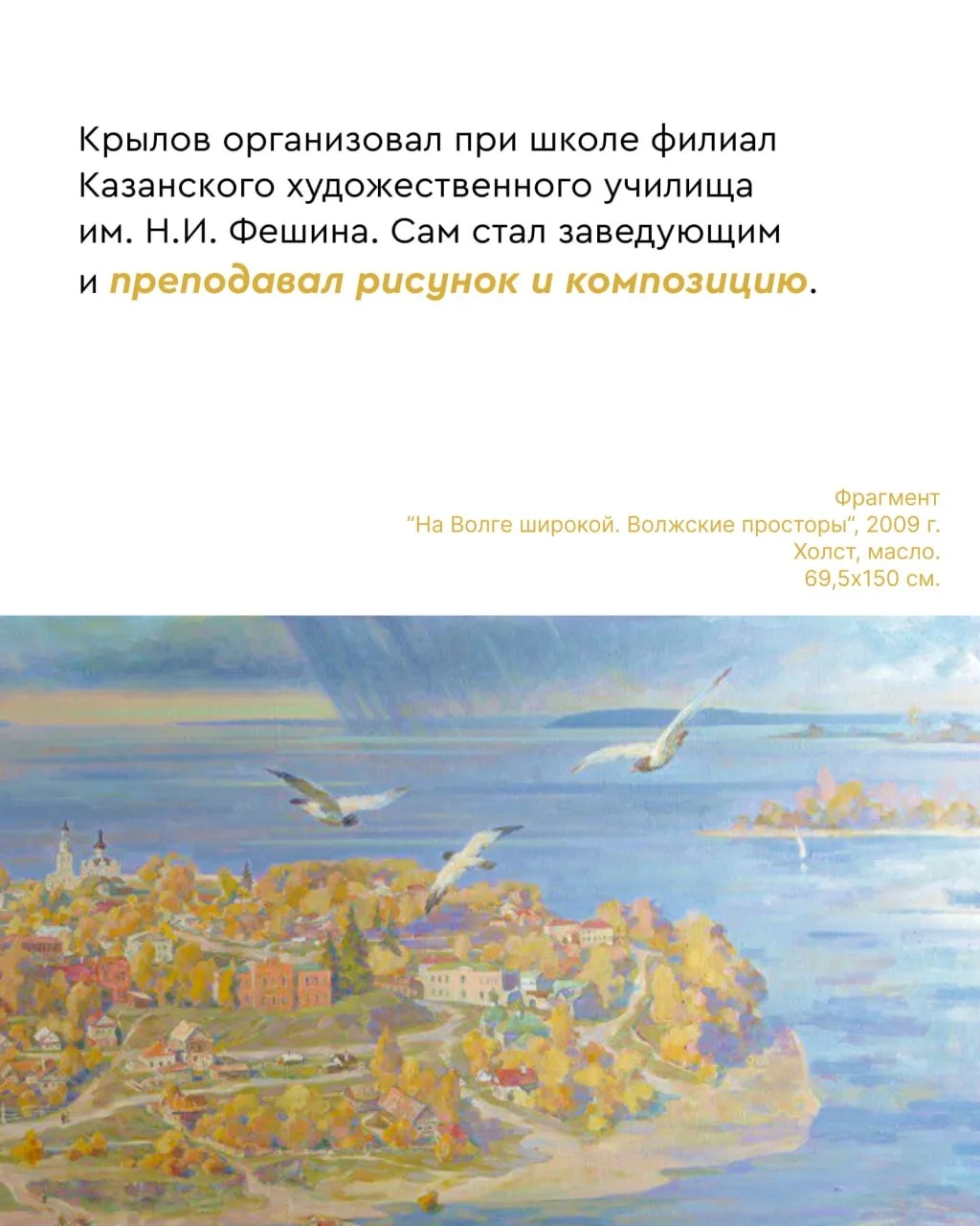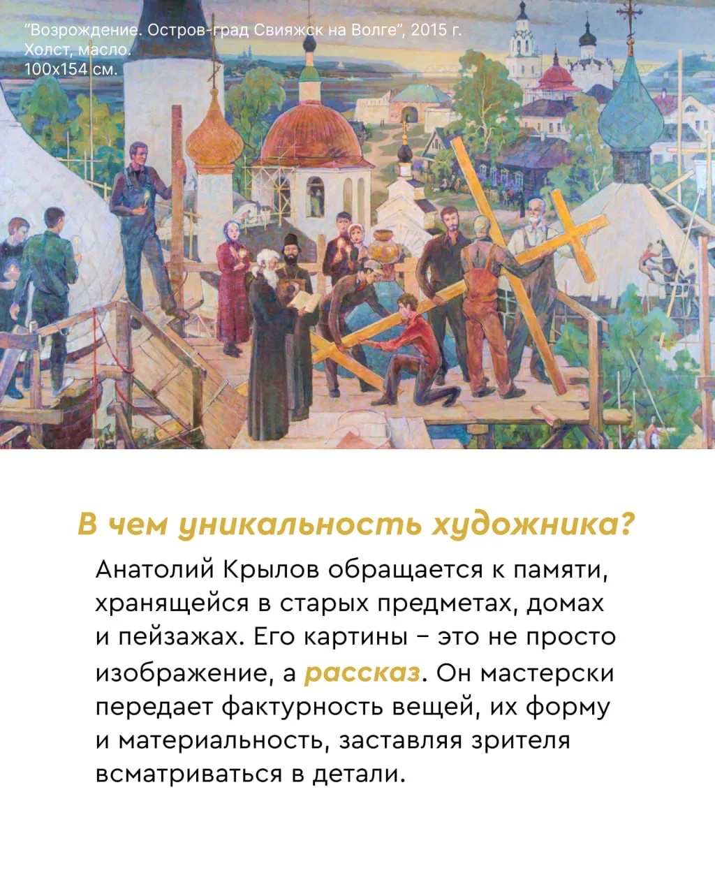 Сегодня мы расскажем о художнике, чье имя неразрывно связано со Свияжском. Анатолий Крылов — живописец, педагог и общественный деятель, который более 40 лет своей жизни посвятил искусству и воспитанию новых талантов.