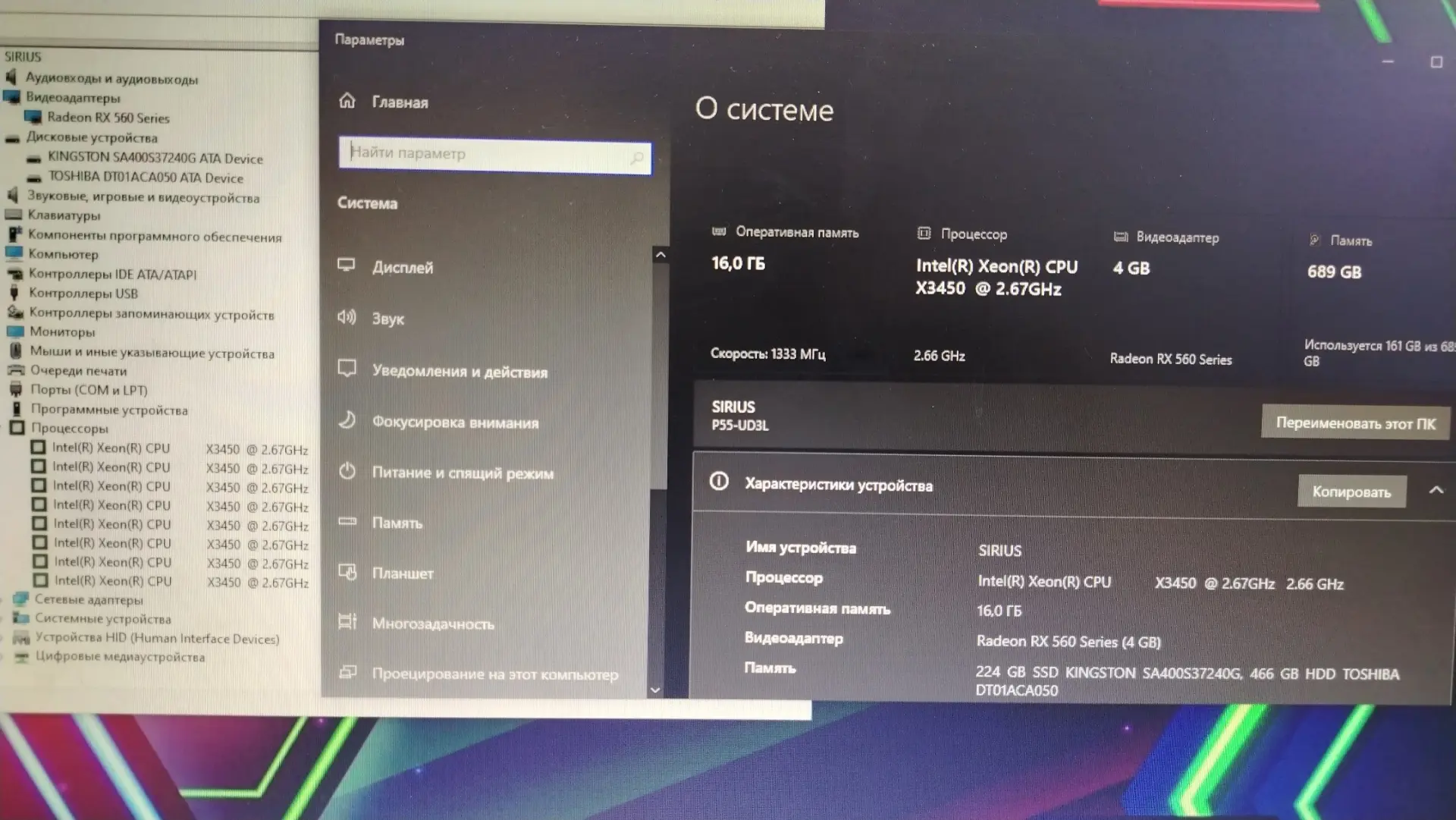 Процессор: 8 логических 4 физических ядра Intel xeon x3450