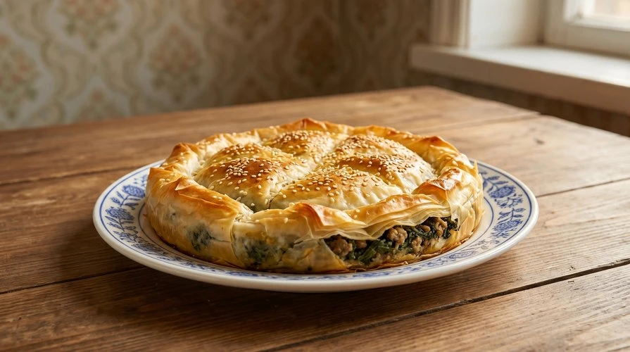 — Хрустящий слоёный пирог с сочной мясной начинкой и шпинатом.