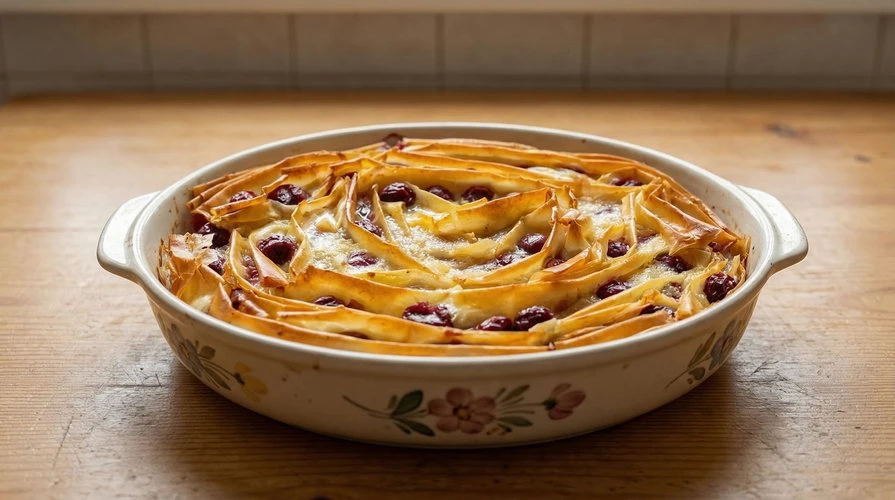 — Хрустящий, нежный пирог из слоёного теста фило с ягодной начинкой и сливочной заливкой.