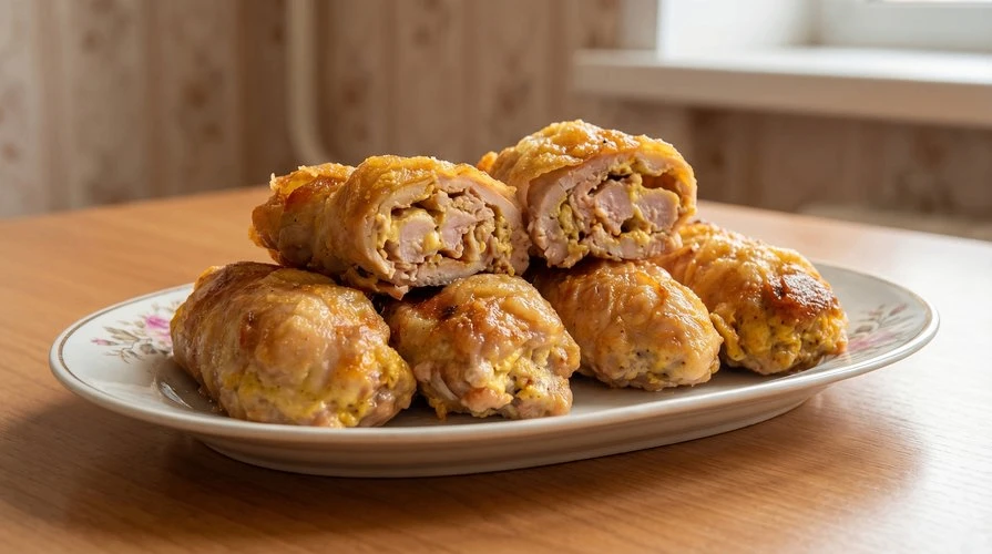 — Нежный, сочный куриный рулет с ароматной грибной начинкой.