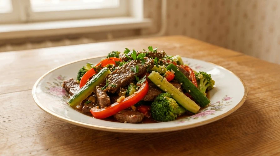 Говядина с овощами в соевом соусе
