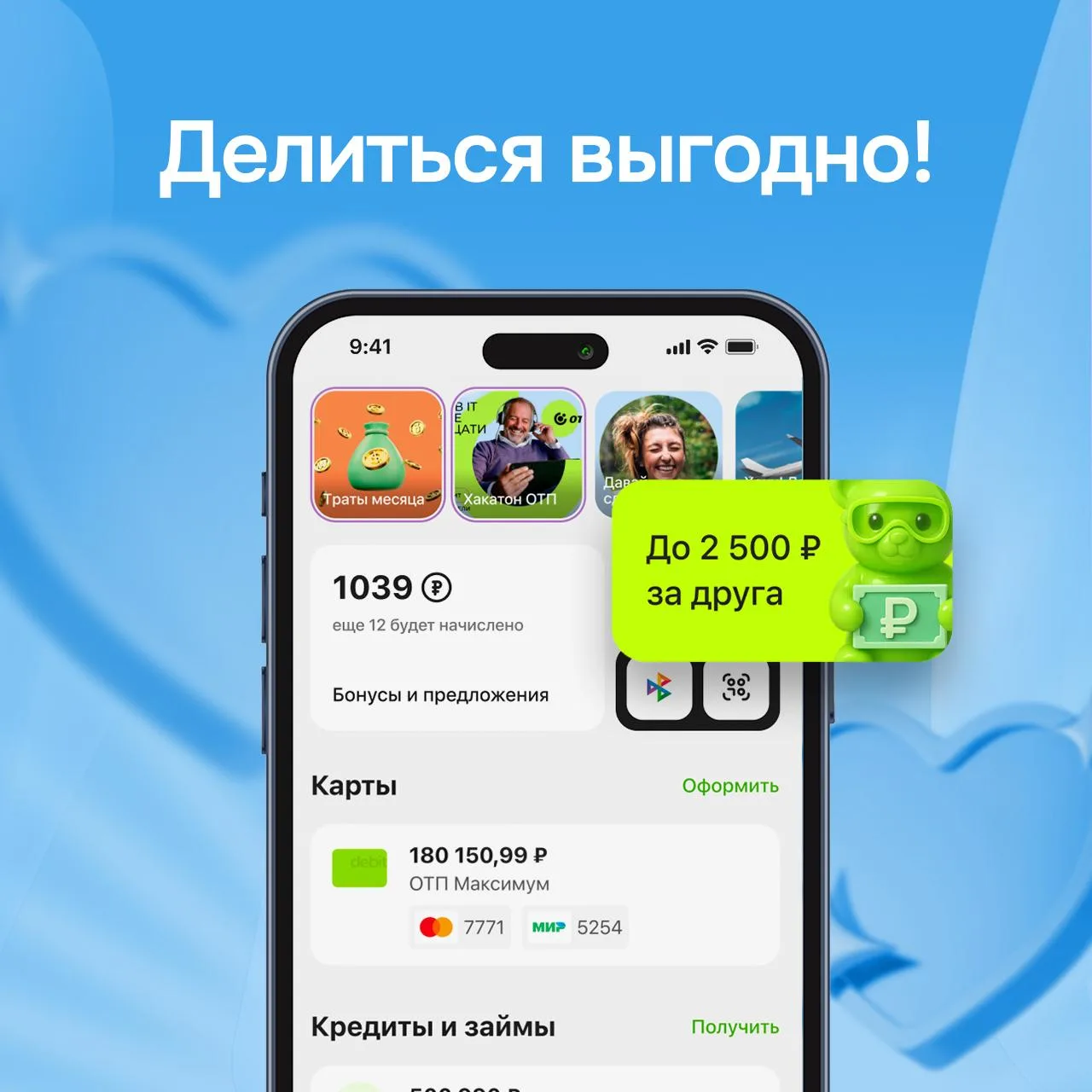 В ОТП Банке можно получать деньги просто за то, что советуете друзьям хорошие вещи. Расскажите им про наши карты — и получите бонус, выполнив условия по программе.