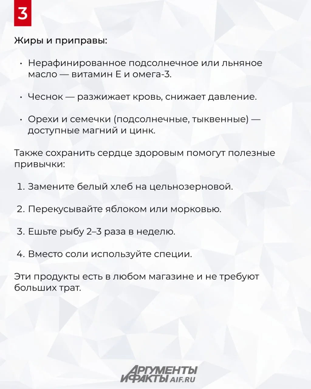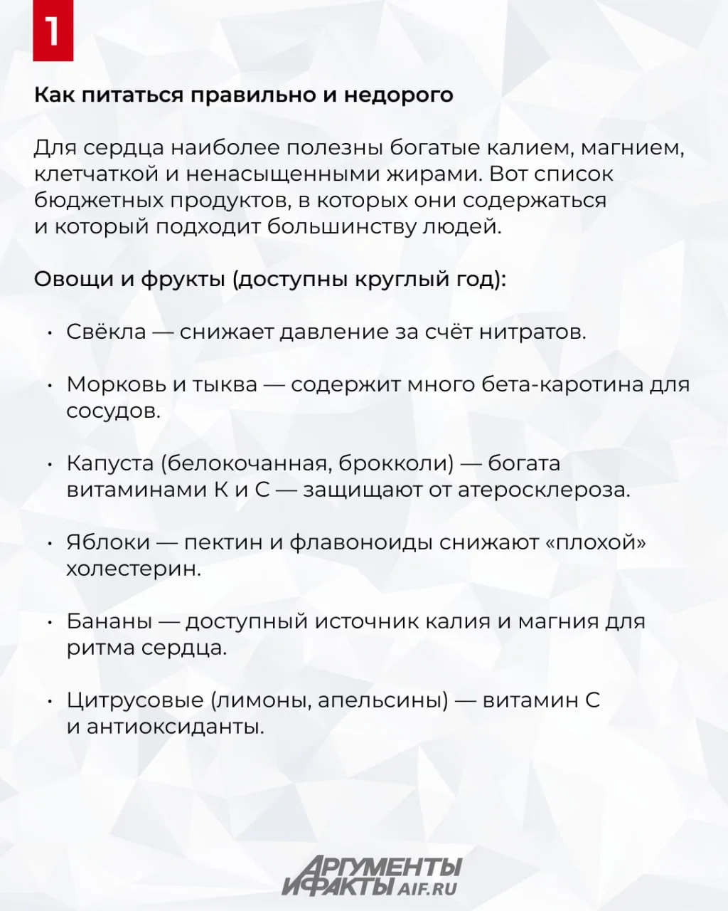 Важную роль в профилактике развития проблем с сердцем и сосудами играет образ жизни, в том числе — питание. Но правильное питание — это не всегда дорогие или сложные блюда. Что можно есть для здоровья сердечно-сосудистой системы хоть каждый день — главное об этом в карточках АиФ. #АиФ_полезное