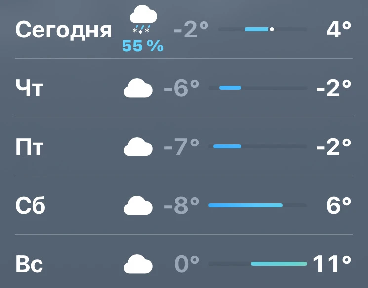 Утром температура составит около -5°, но из-за ветра будет ощущаться как -11°. Днём столбик термометра опустится до -2°, по ощущениям — до -9°. Пройдёт снег.
