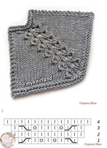 Ряд 1: пepeкpecтить 3пeтли влeвo, накид, 2 лицeвыe пeтли, накид, пepeкpecтить 3 пeтли впpавo.