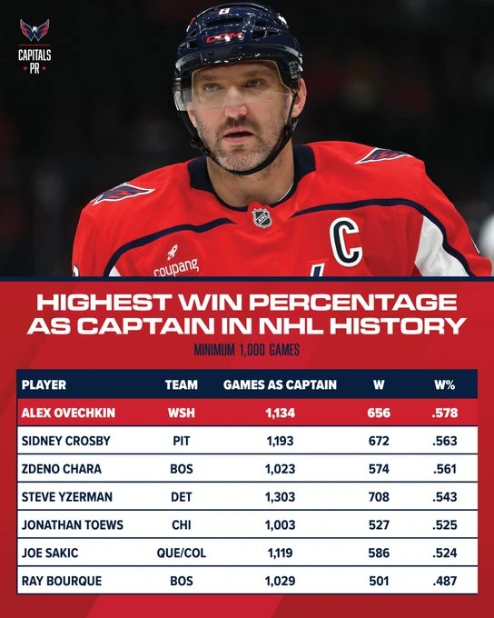 📊 Эти цифры говорят сами за себя: с капитанской нашивкой Ови привел "Вашингтон" к 656 победам в 1134 матчах, что составляет феноменальные 57.8% выигрышей! 💪 Это лучший показатель среди всех капитанов НХЛ!