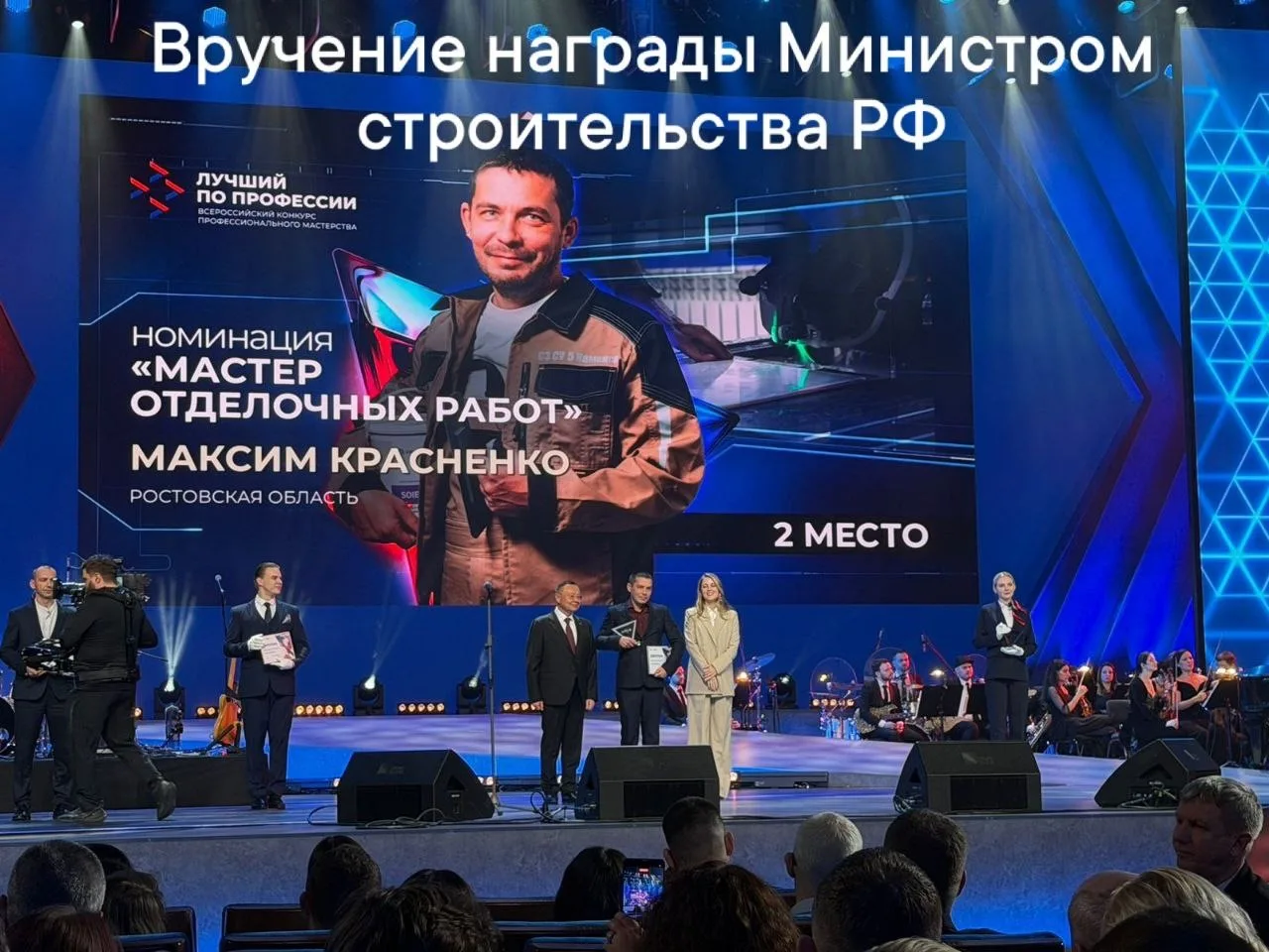 Чествовали победителей рабочих профессий со всей России в 20 номинациях. Из них три победителя из Ростовской области по профессиям: сварщик, механизатор и наш мастер отделочных работ Красненко Максим.