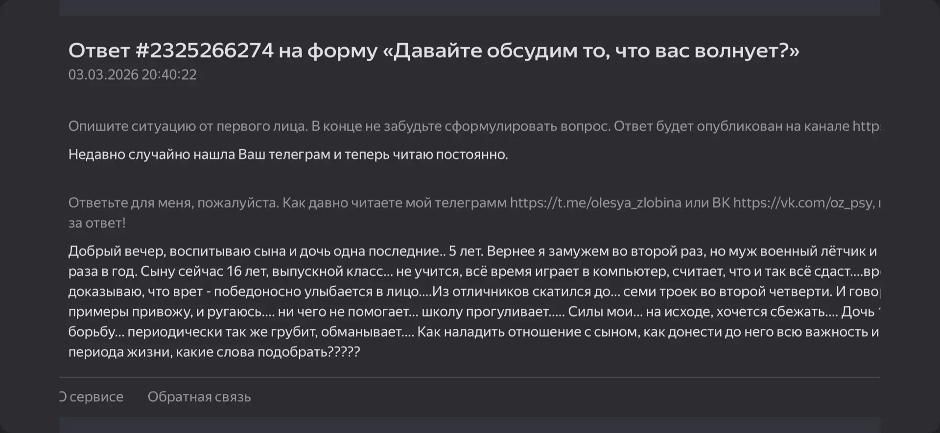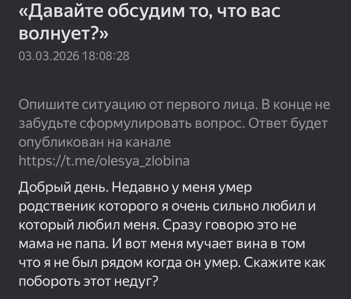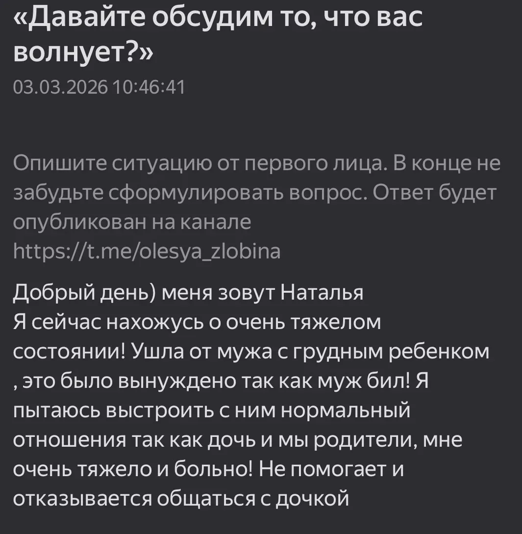 Напоминаю, что задать свой вопрос мне (я клинический и кризисный психолог) можно сюда: https://forms.yandex.ru/cloud/65af65de2530c201e3d4b44a/