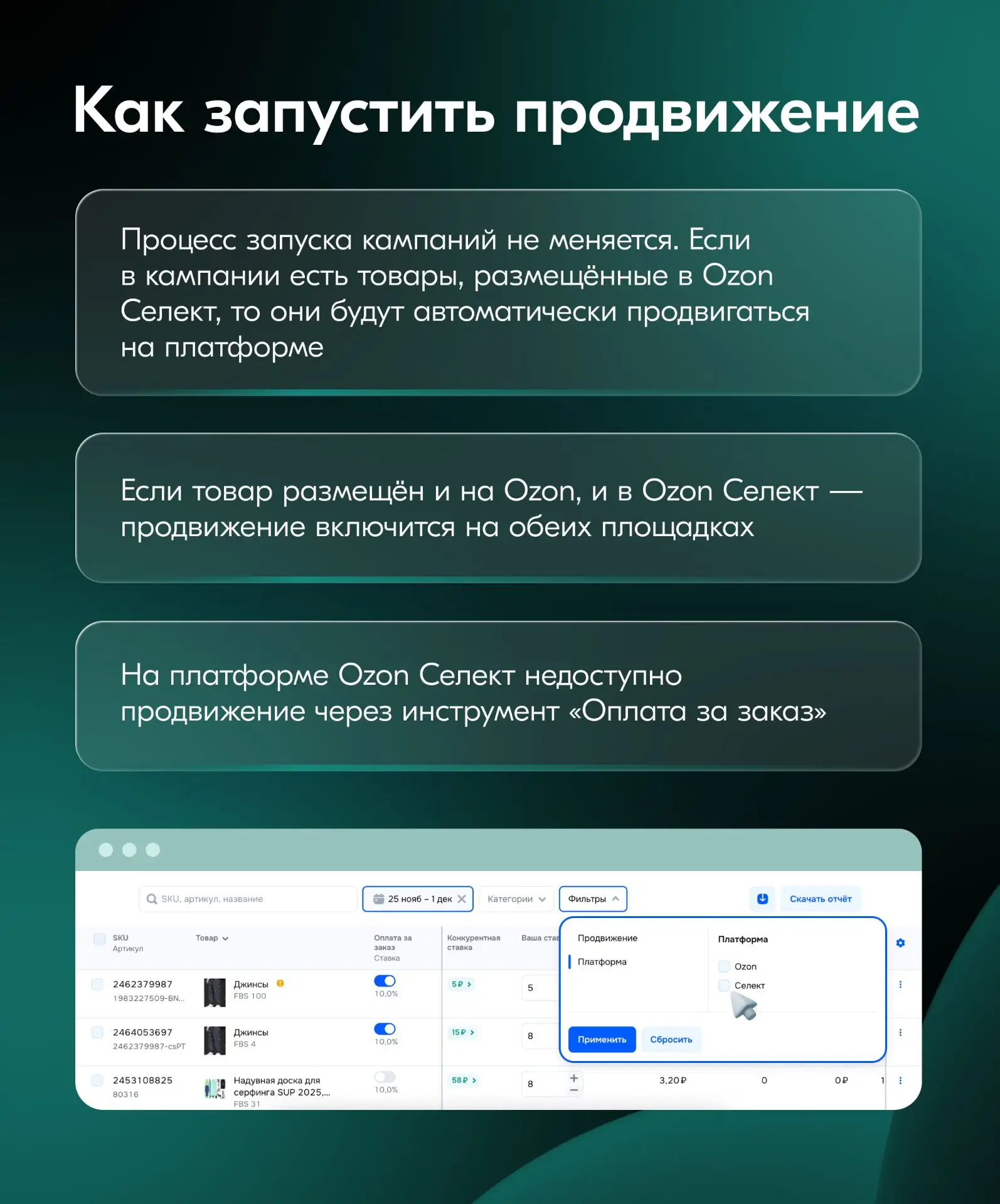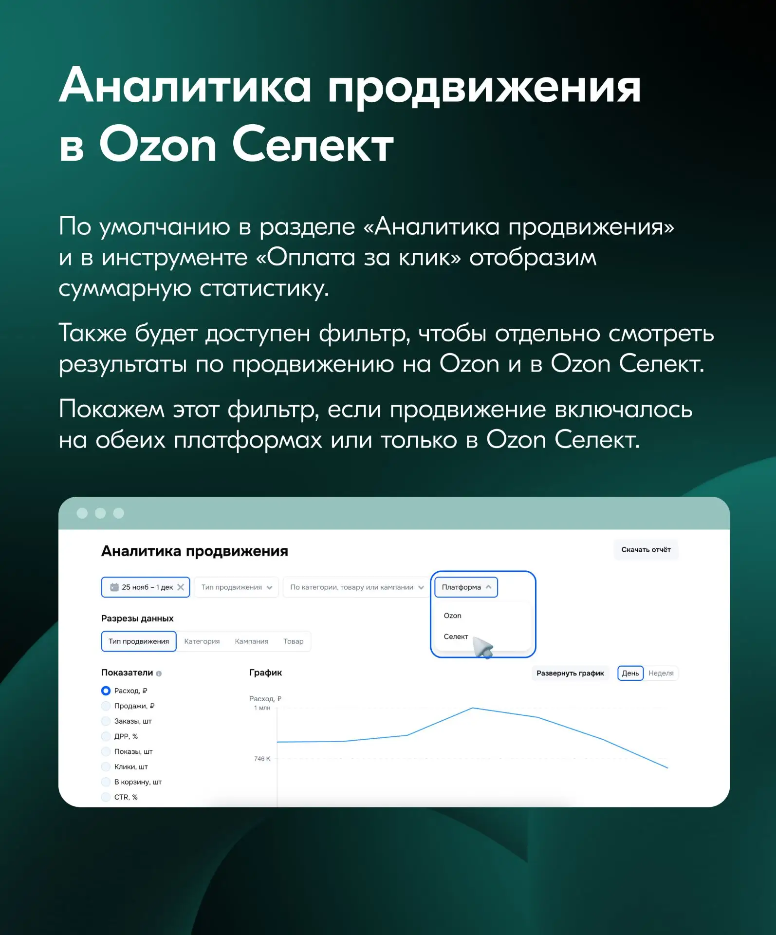 В карточках рассказываем, как запустить продвижение в Ozon Селект и делимся результатами первых кампаний.