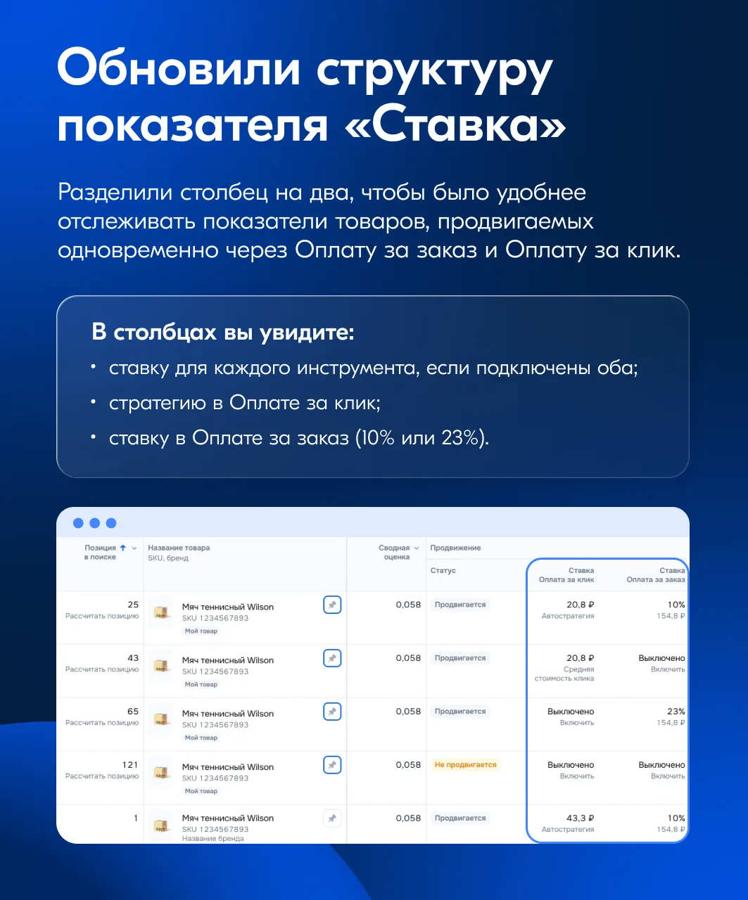 Если товары (ваши и конкурентов) продвигаются с помощью Комбо-модели, в аналитике отобразятся обе ставки — за клик и за заказ. Для CPC-кампаний также покажем стратегию управления ставками: «Вывод в топ», «Средняя стоимость клика» или Автостратегия.