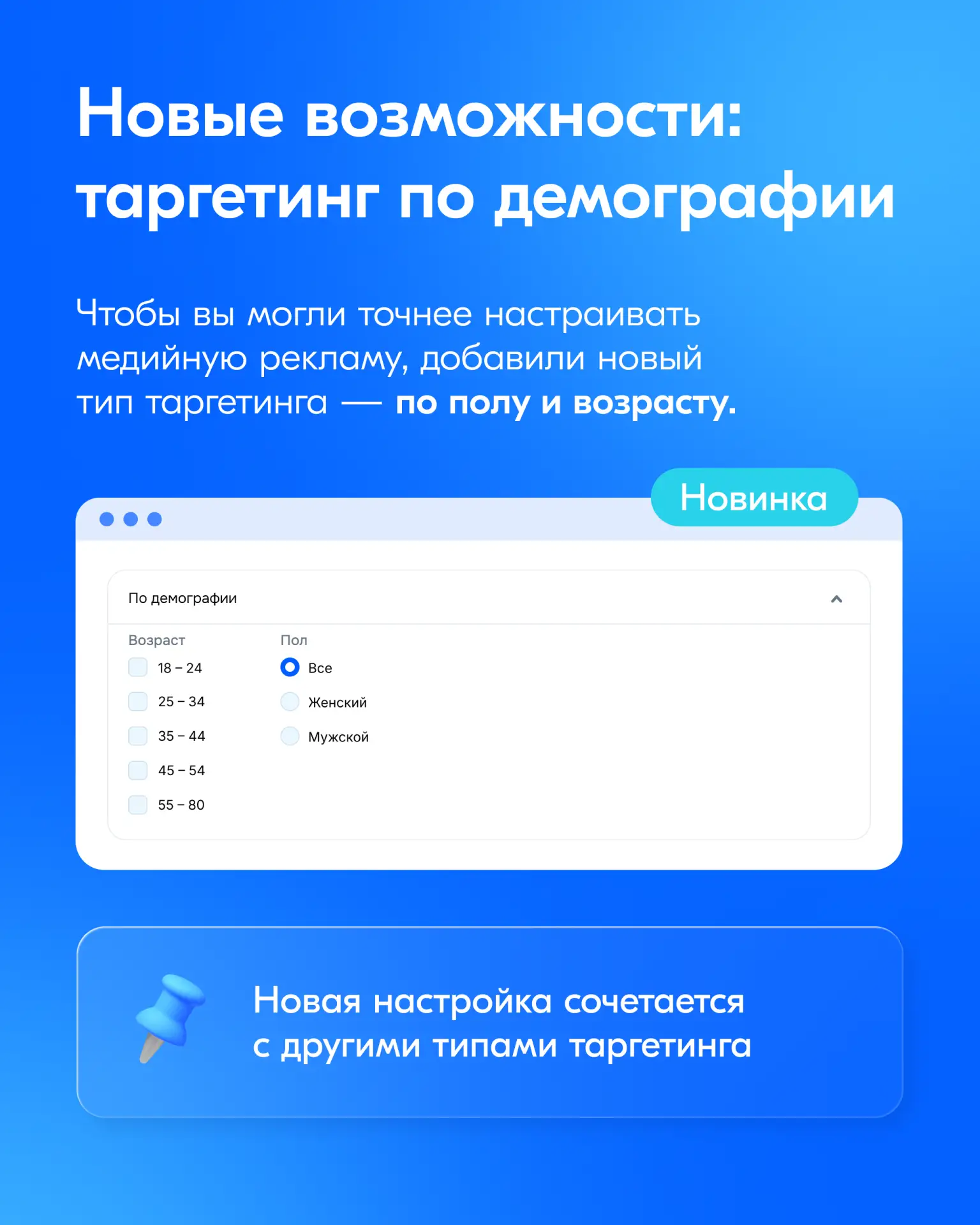 Добавили новый тип таргетинга в медийной рекламе — по полу и возрасту. Он доступен для всех форматов, за исключением: